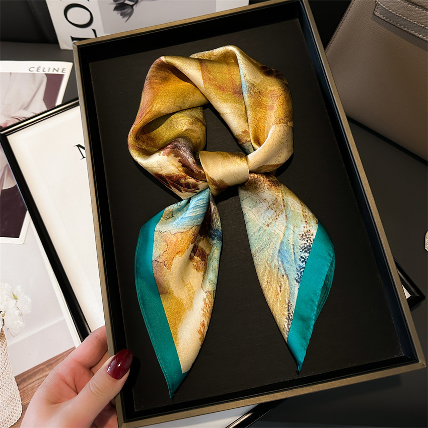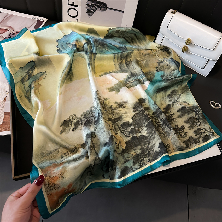 Chinese trend and style silk scarf landscape ink wash square scarf 70cm imitation silk scarf Thousand Miles of rivers and mountains Picture New spring and summer women's silk scarf