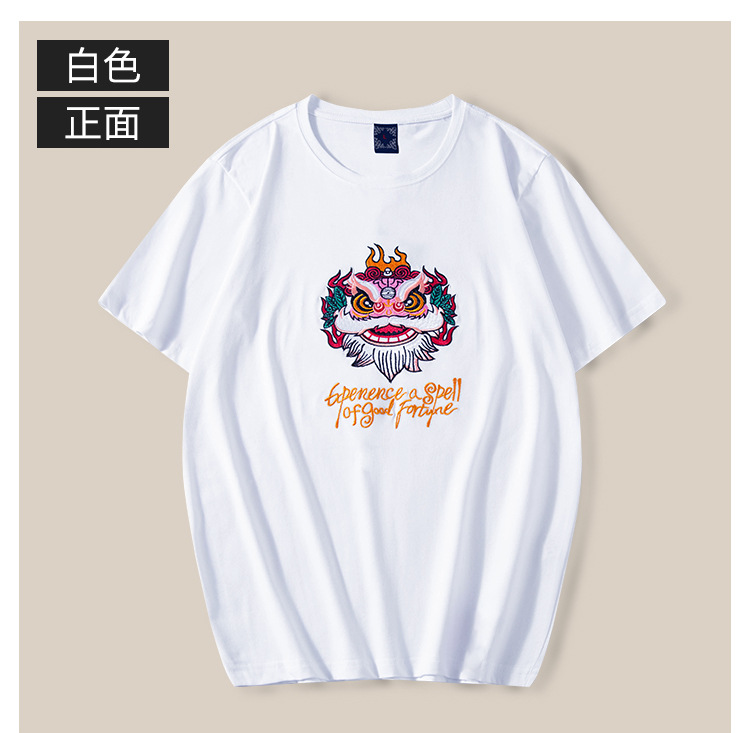 Chinese trend short-sleeved men's cotton T-shirt with lion dance embroidery 2024 new summer Chinese trend, large-sized round-neck loose couple outfits