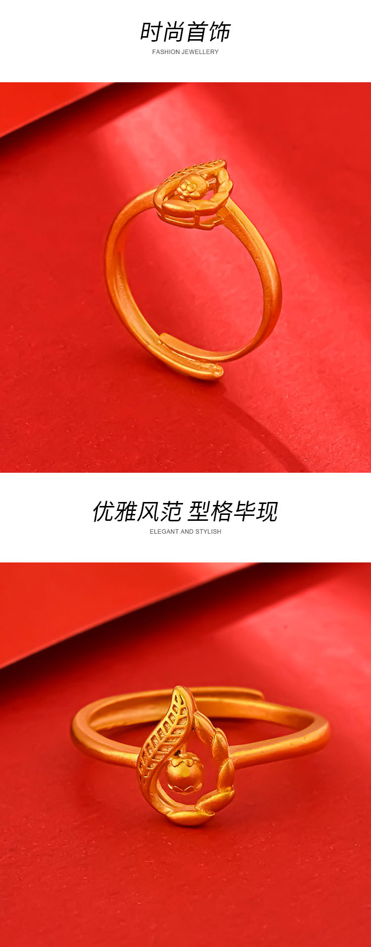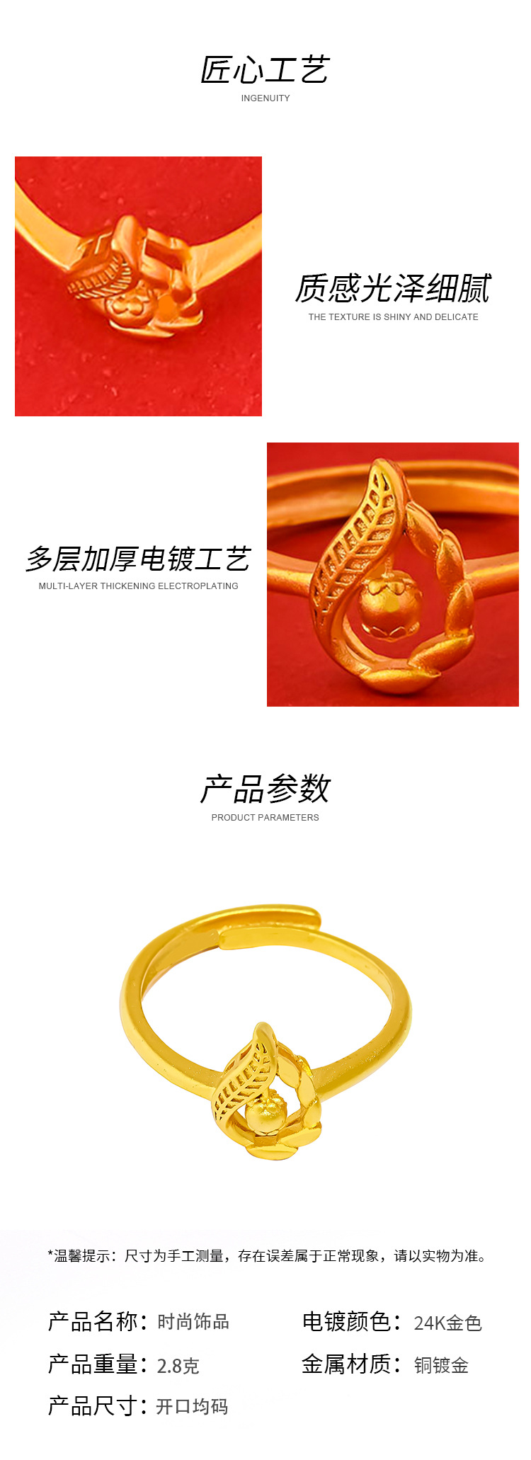 Chuangmei Jewelry's 24K gold-plated leaf ring is a unique and retro design ring for women, a wedding ring
