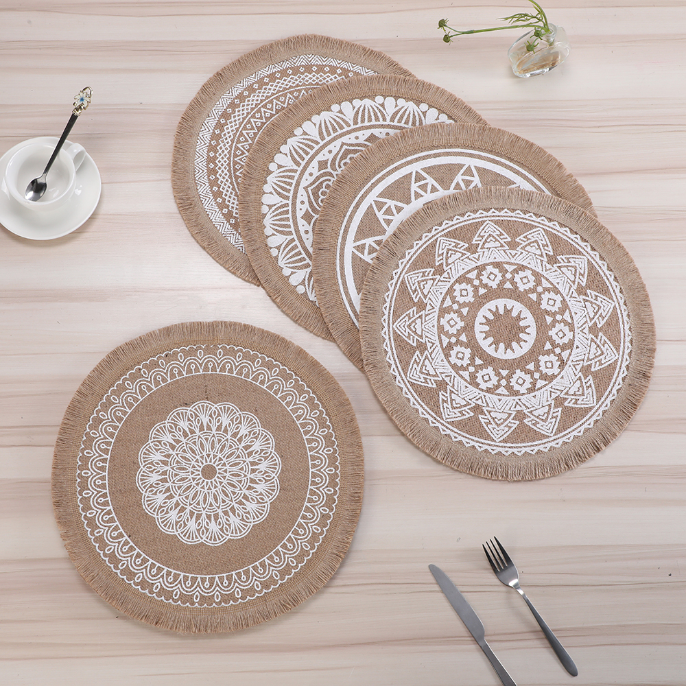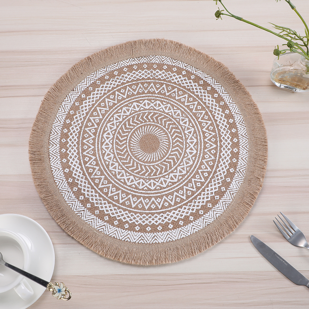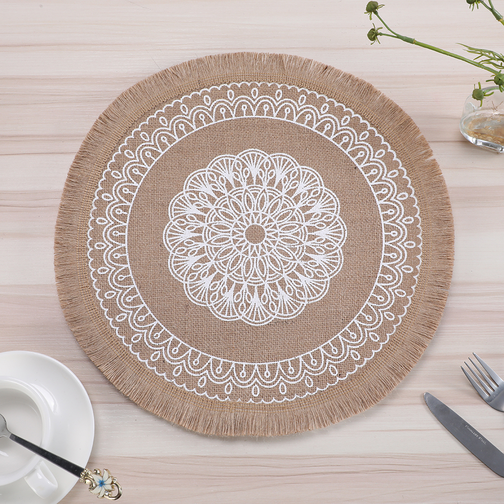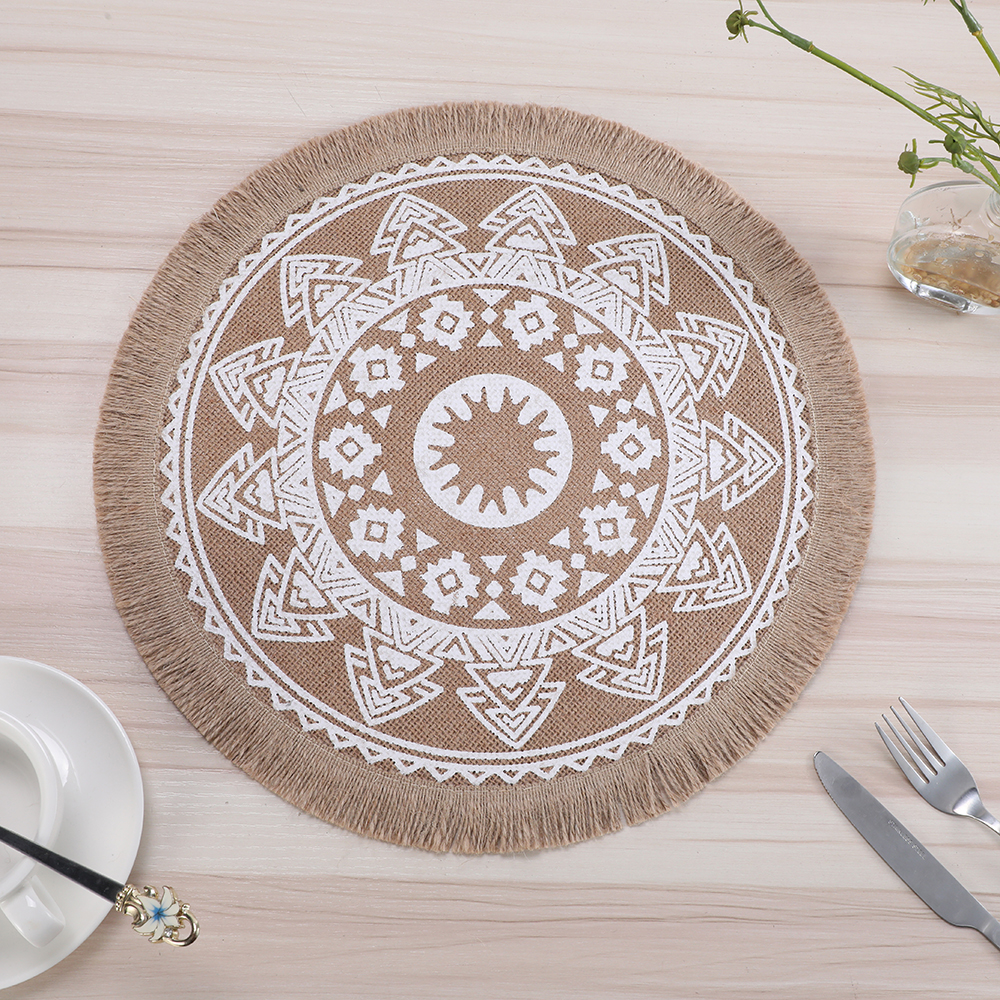 Circular printed heat insulation pad with linen thread, coffee table mat, retro style with tassels, Western table mat, home decoration pad, table mat, heat-resistant pad