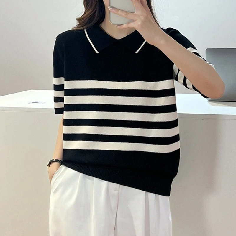 Color-blocking striped short-sleeved knitted sweater, summer Korean-style simple commuting ice silk top, pullover, base layer, lapel T-shirt for women
