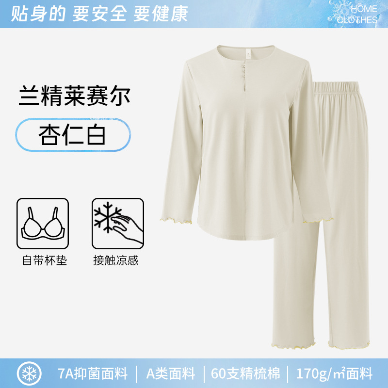 【 Cool Lyocell 】 Chinese-style pajamas for women's summer with chest pads, Class A cotton long-sleeved shirts and long pants for women's home wear set