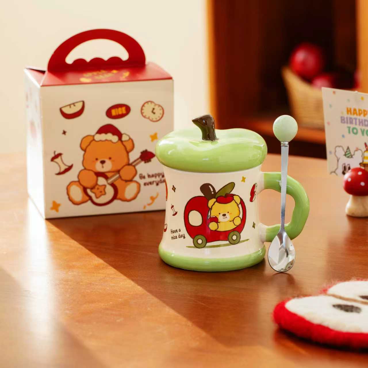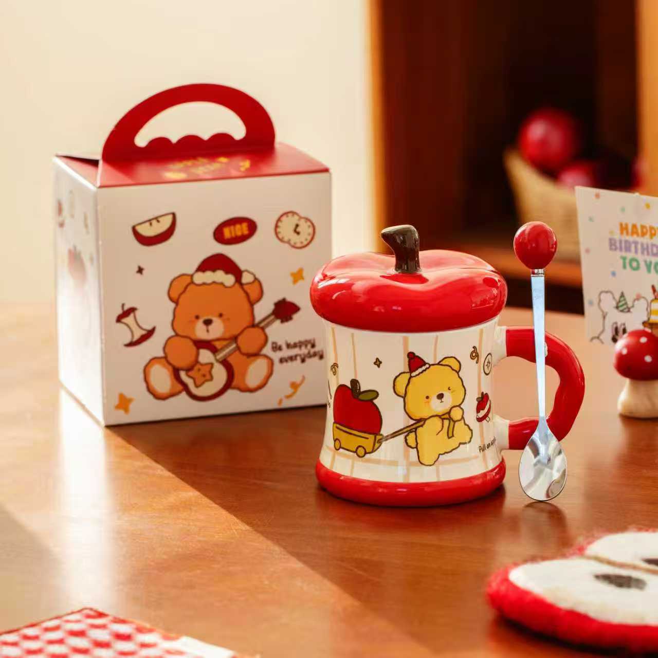 Creative covered ceramic cup, Apple Bear mug, Love Lover souvenir set, large capacity water cup with handle