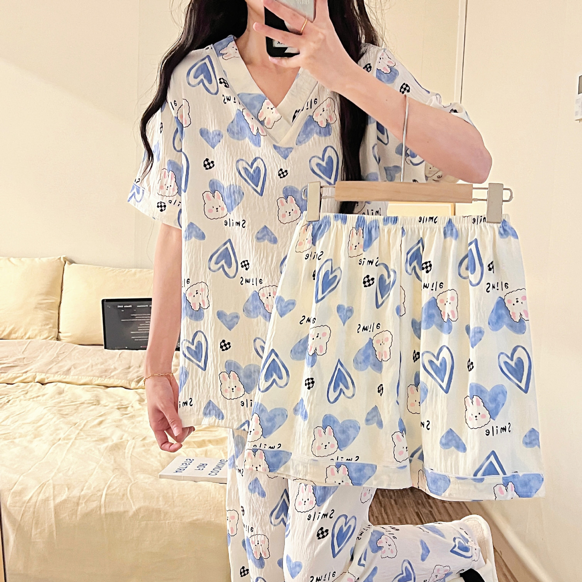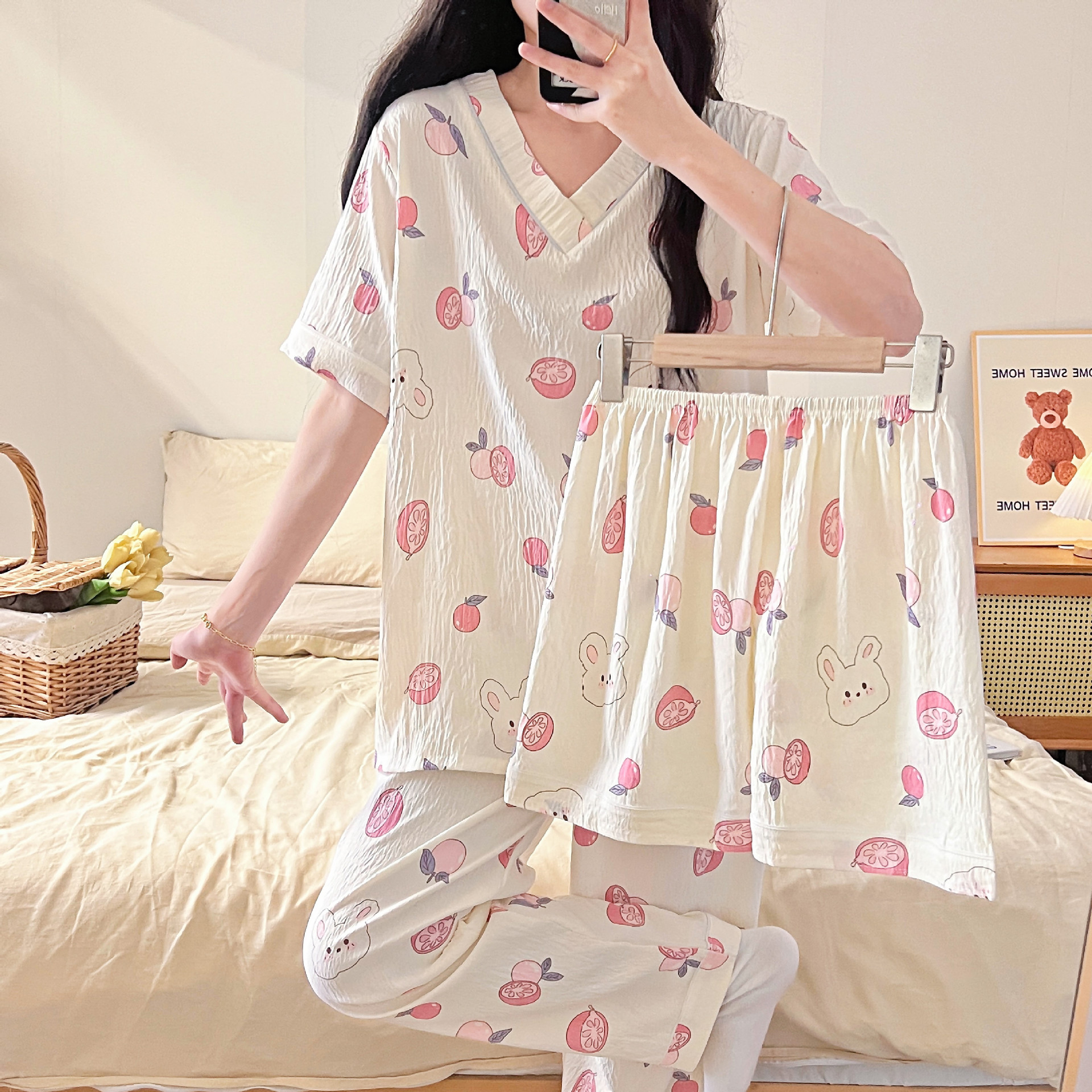 Cross-border bestseller V-neck pajama women's cloud cotton three-piece set summer short-sleeved, short-sleeved, short-sleeved and long-sleeved cartoon home wear set