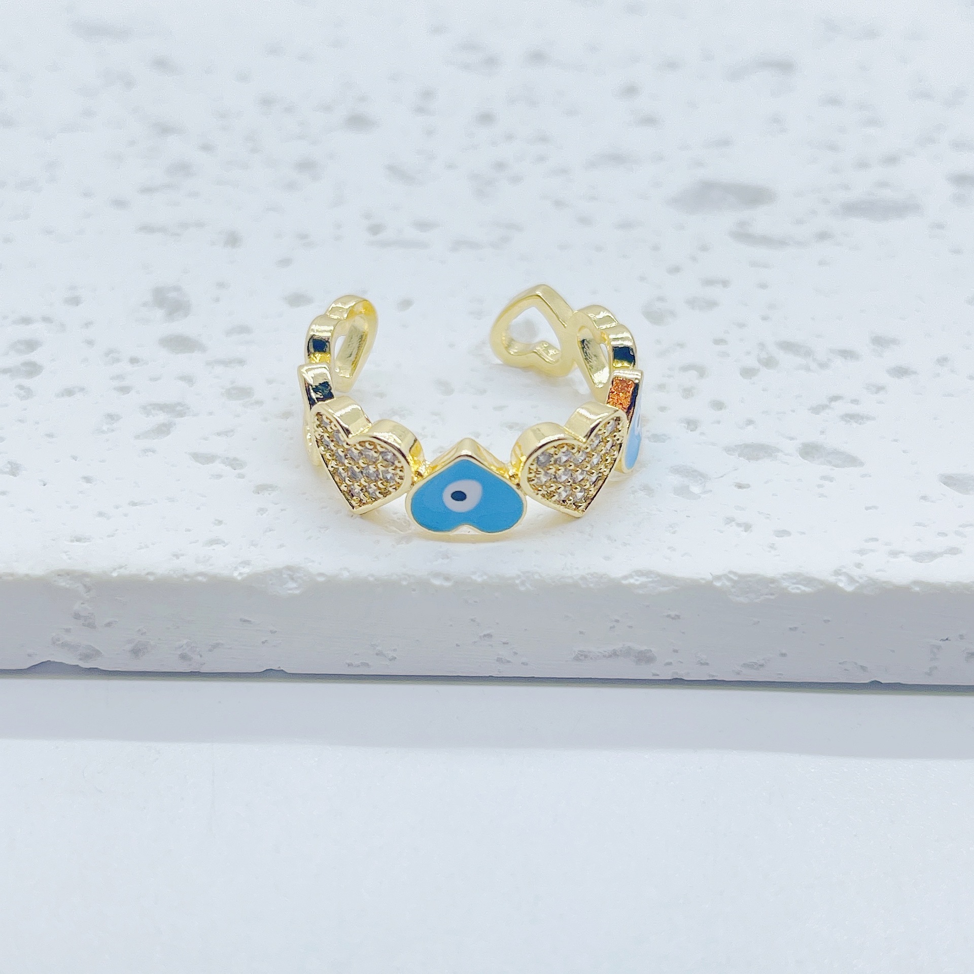 Cross-border Bohemian heart-shaped oil-infused eyes, devil's eyes, brass plated with real gold zircon fashionable open ring for women