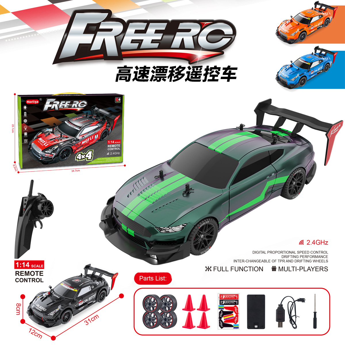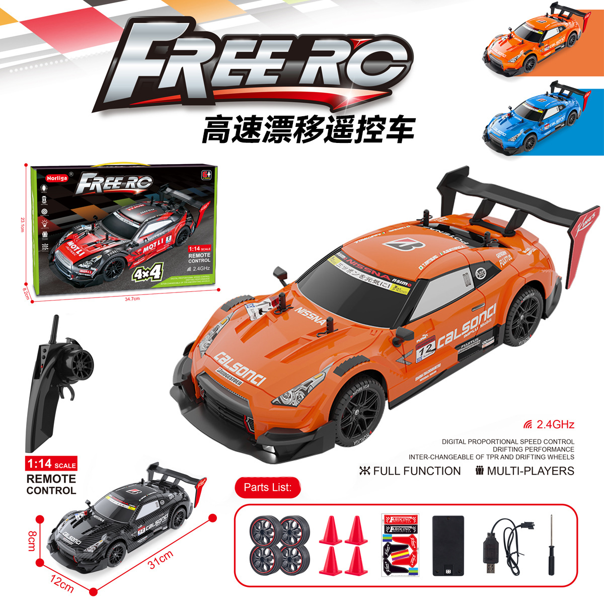 Cross-border exclusive remote control four-wheel drive drift car, high-speed racing car, 2.4g competition car model, children's charging toy GTR