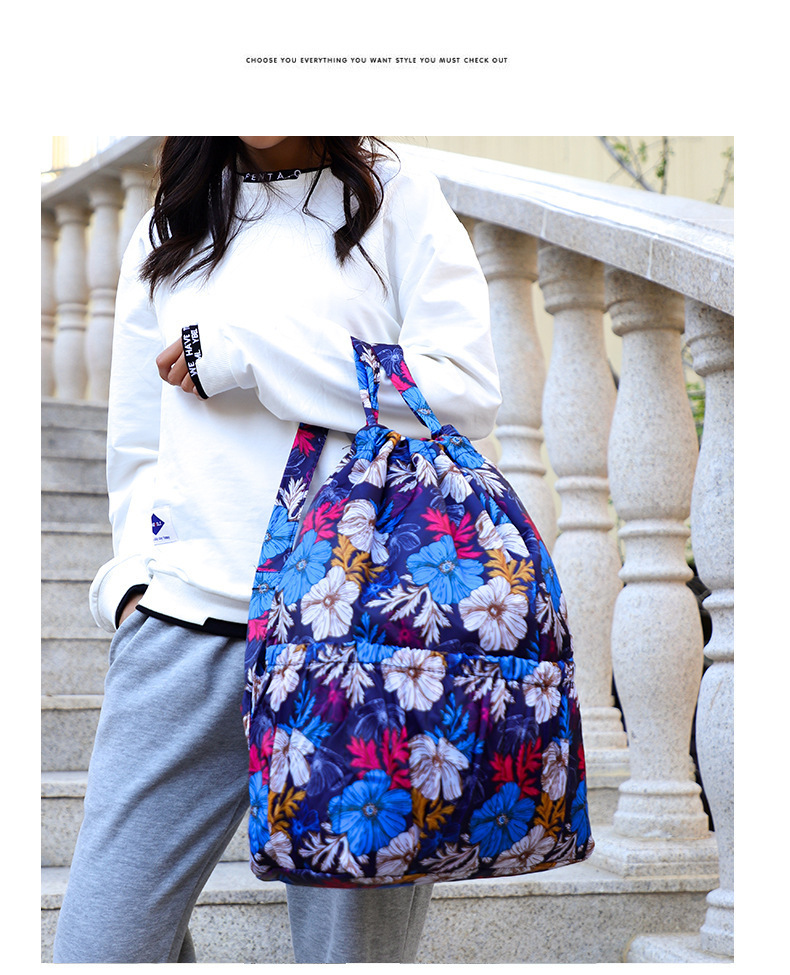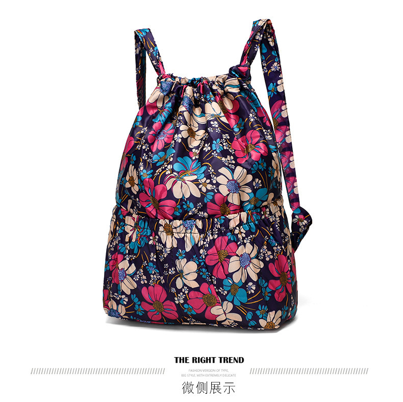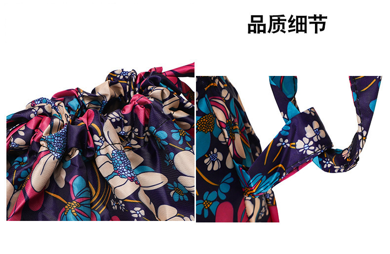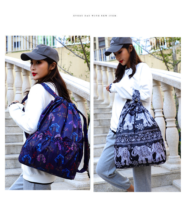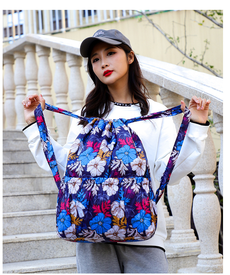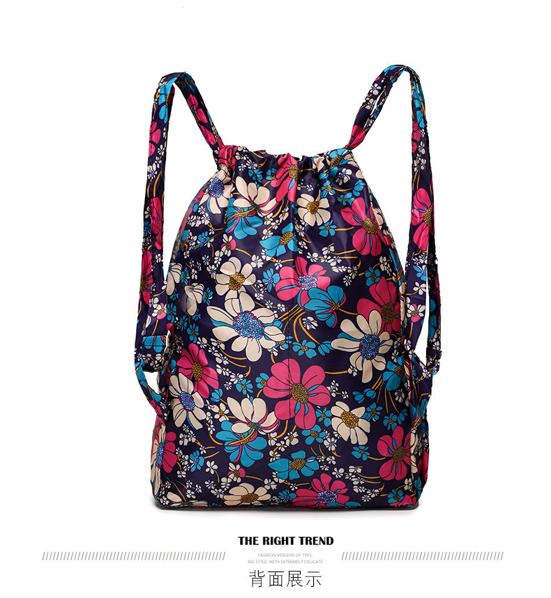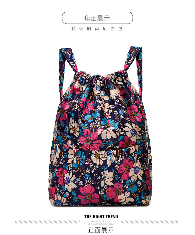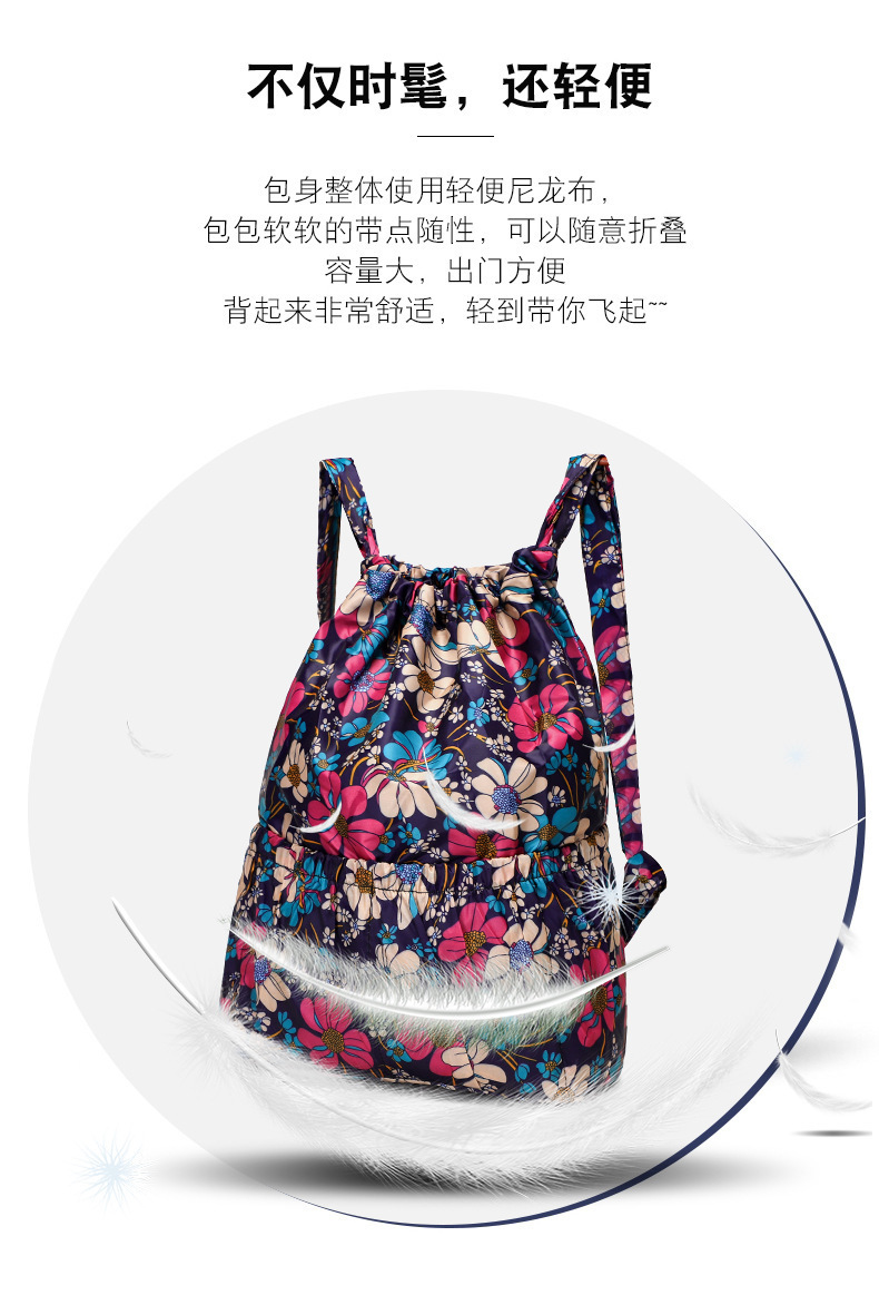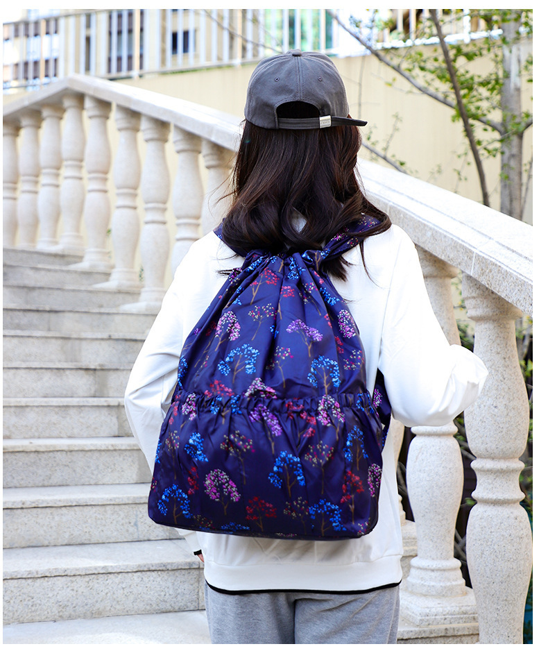Cross-border floral fabric drawstring bag, drawstring large capacity backpack, women's folding portable shopping bag, outdoor travel backpack