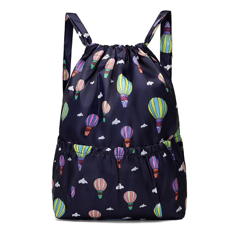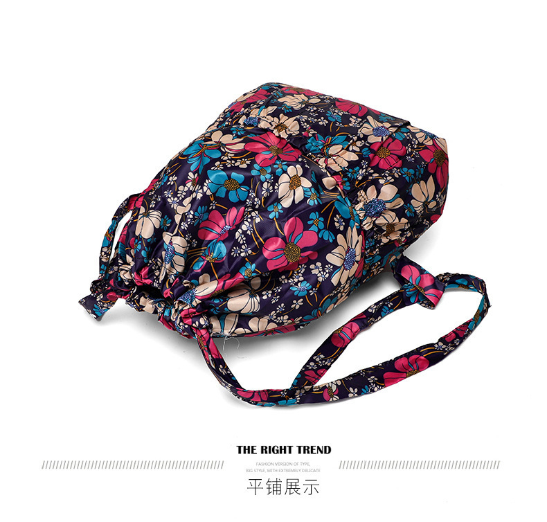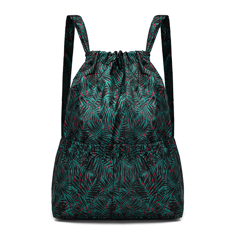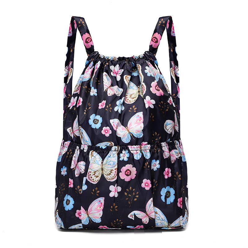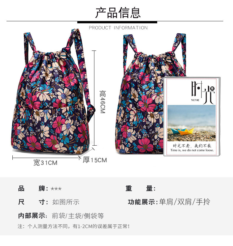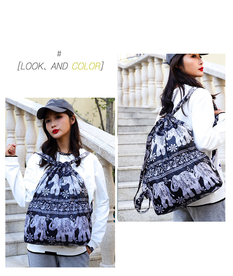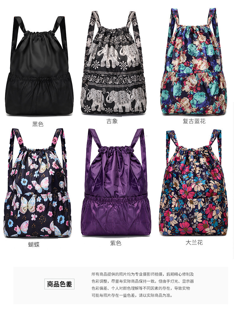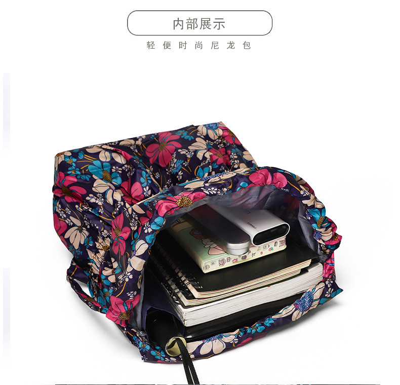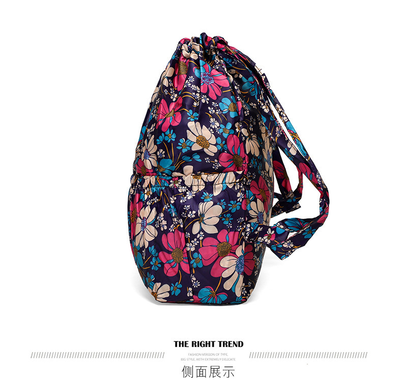 Cross-border floral fabric drawstring bag, drawstring large capacity backpack, women's folding portable shopping bag, outdoor travel backpack