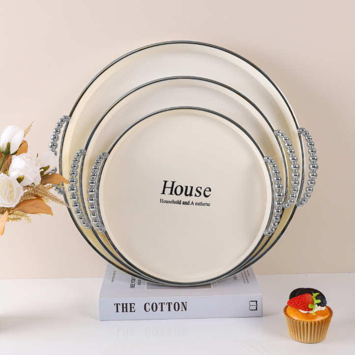 The tray is egg-shaped, with a white background and silver edges, 6513