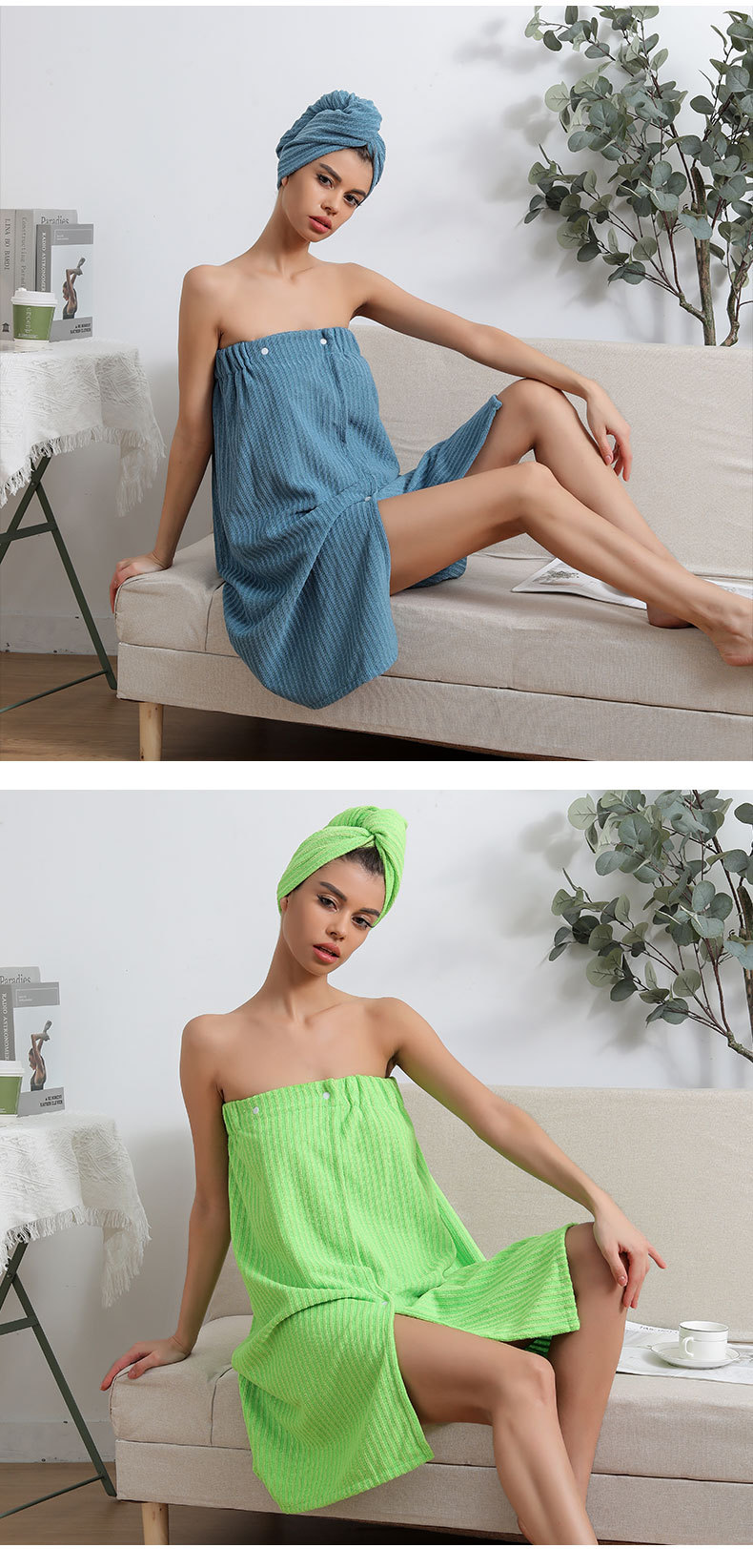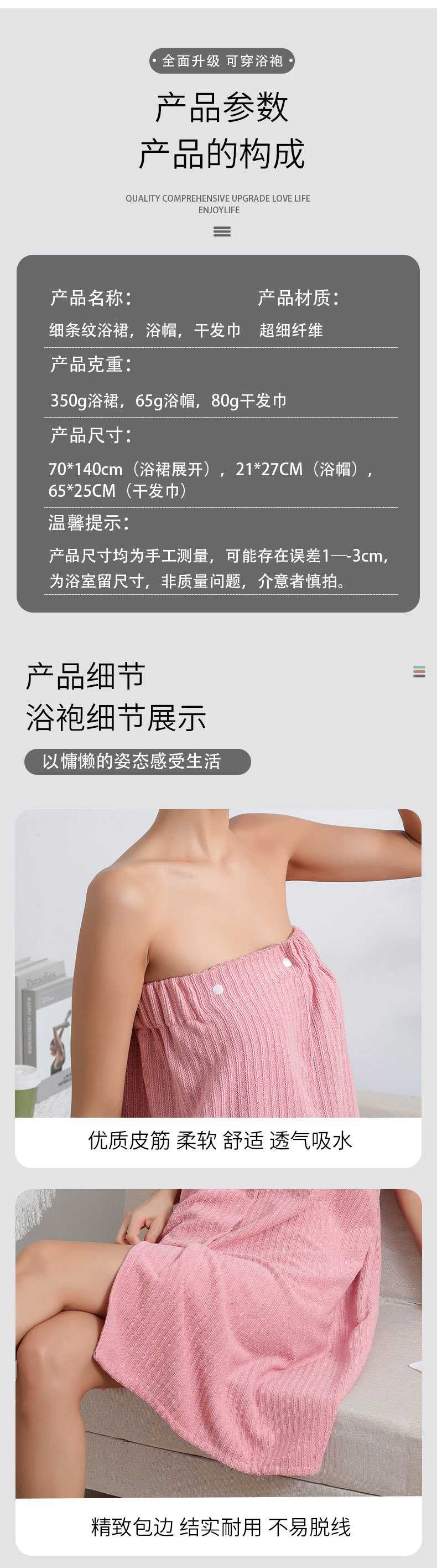 The unfolded bath skirt is 70*140cm, the bath cap is 21*27cm, and the dry hair towel is 65*25CM