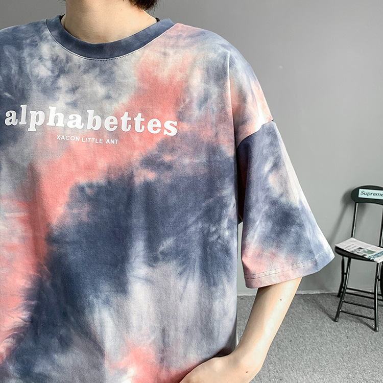Cross-border new Korean style tie-dyed printed letter couple summer short-sleeved T-shirt for women, ins trendy women's wear 2020 loose top