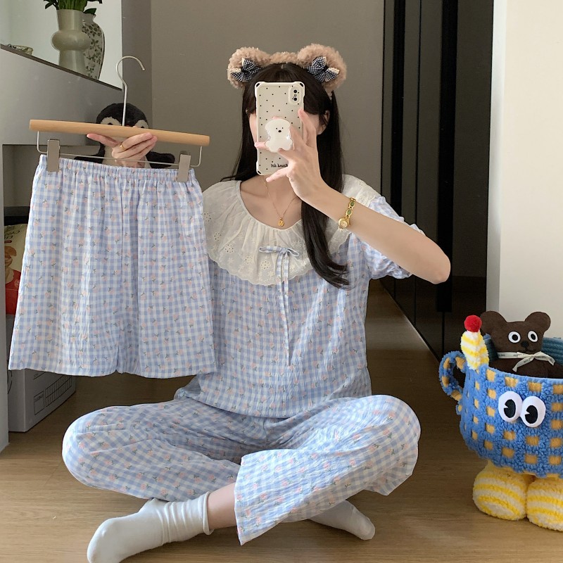 Cross-border pajama women's summer short-sleeved and long pants three-piece set, sweet checkered, popular online celebrity princess-style home wear