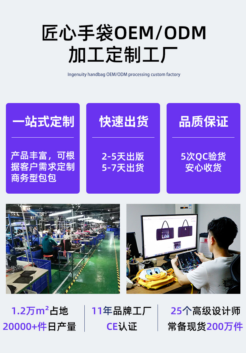 Since its establishment, our company has been committed to the production of medium and high-quality backpacks, chest bags and other casual bags, strictly adhering to the quality requirements of one-inch nylon thread with seven stitches for the front line and one-inch edge bag with six stitches. It has now become a leader in the luggage industry that leads the individualistic, trendy and fashionable young generation. We have now provided OEM services for many well-known brands such as NetEase Youxuan, Ctrip, Evergrande, and Cao Qinghua, and have received high praise and a good reputation. |