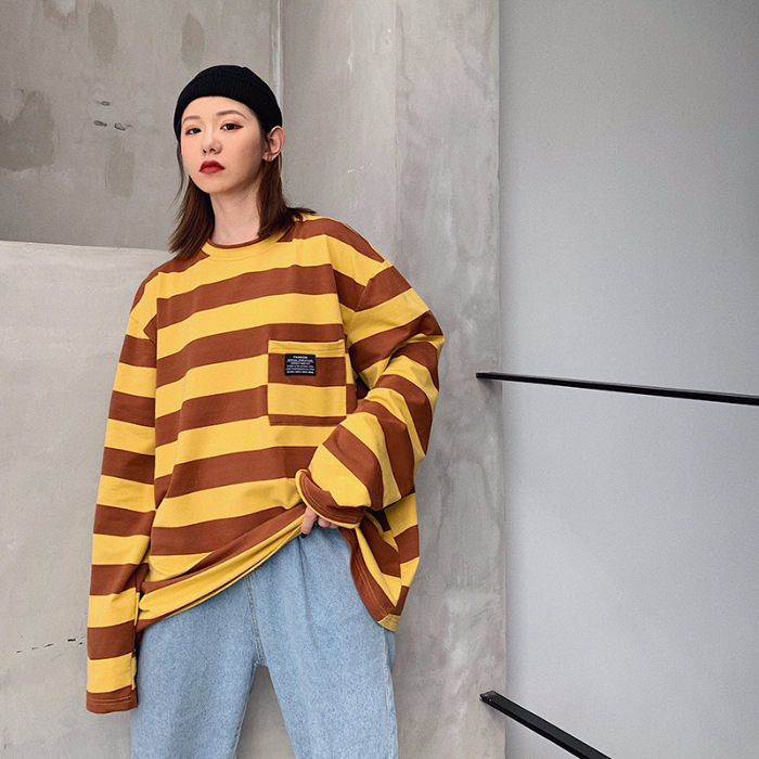 Cross-border striped T-shirt for women 21 New striped long-sleeved T-shirt for women on Instagram Harajuku loose Korean-style top in stock