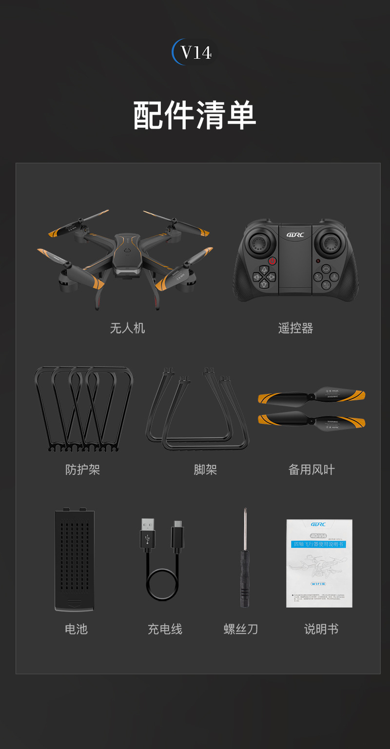 | Accessories: Aircraft *1/ Remote control *1/ Spare fan blades *4/ fan blade protection cover *4/ Landing gear *2/USB charging cable *1/ screwdriver *1/ Instruction manual *1 | |||