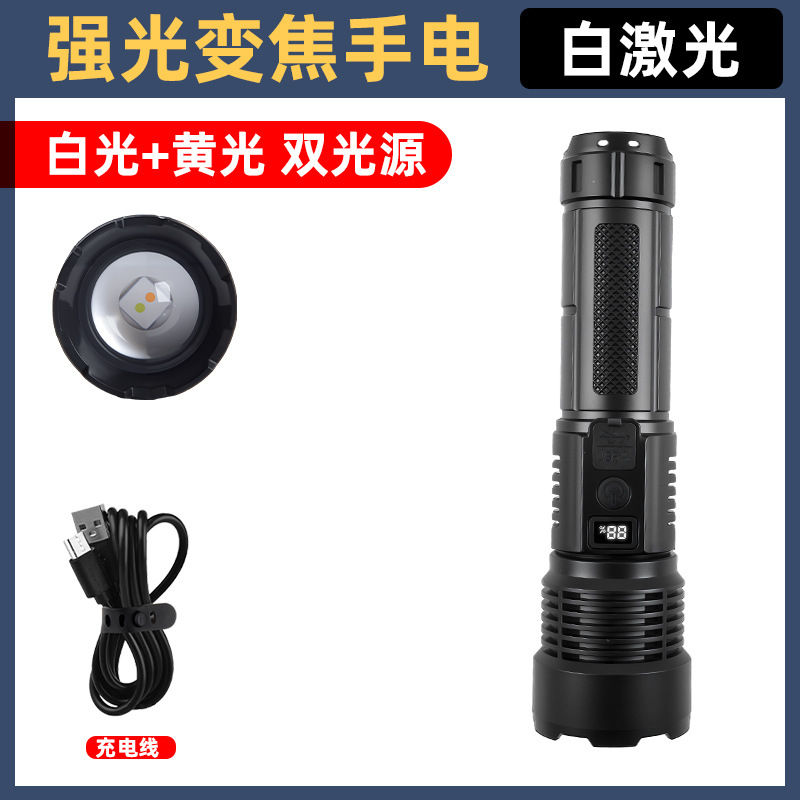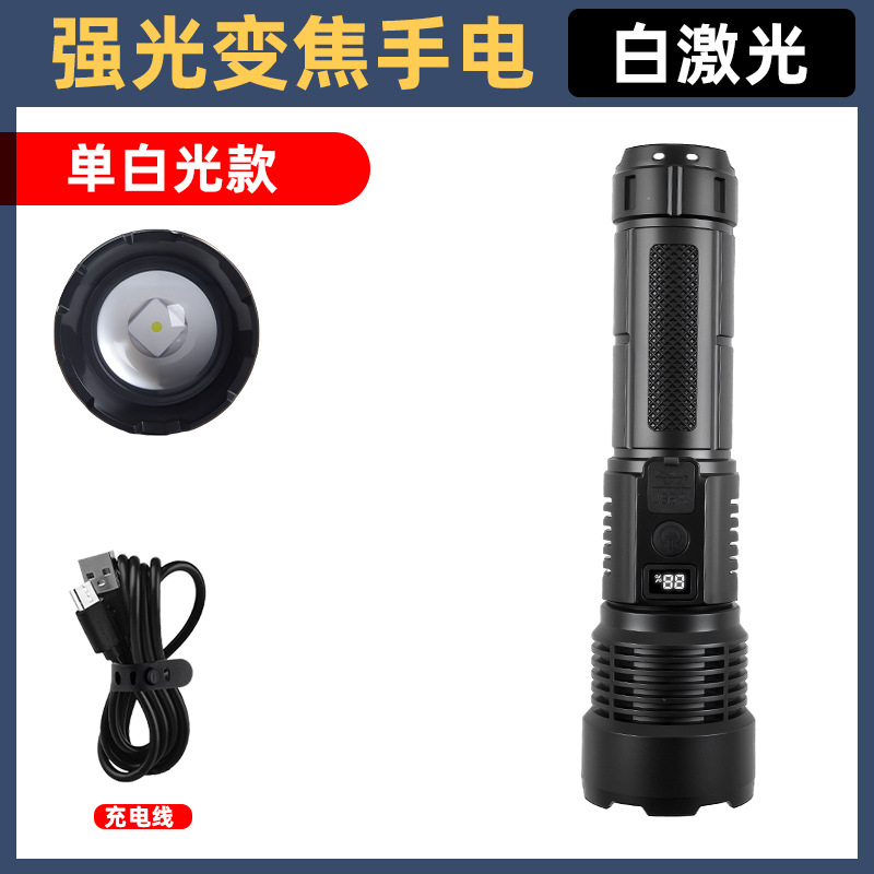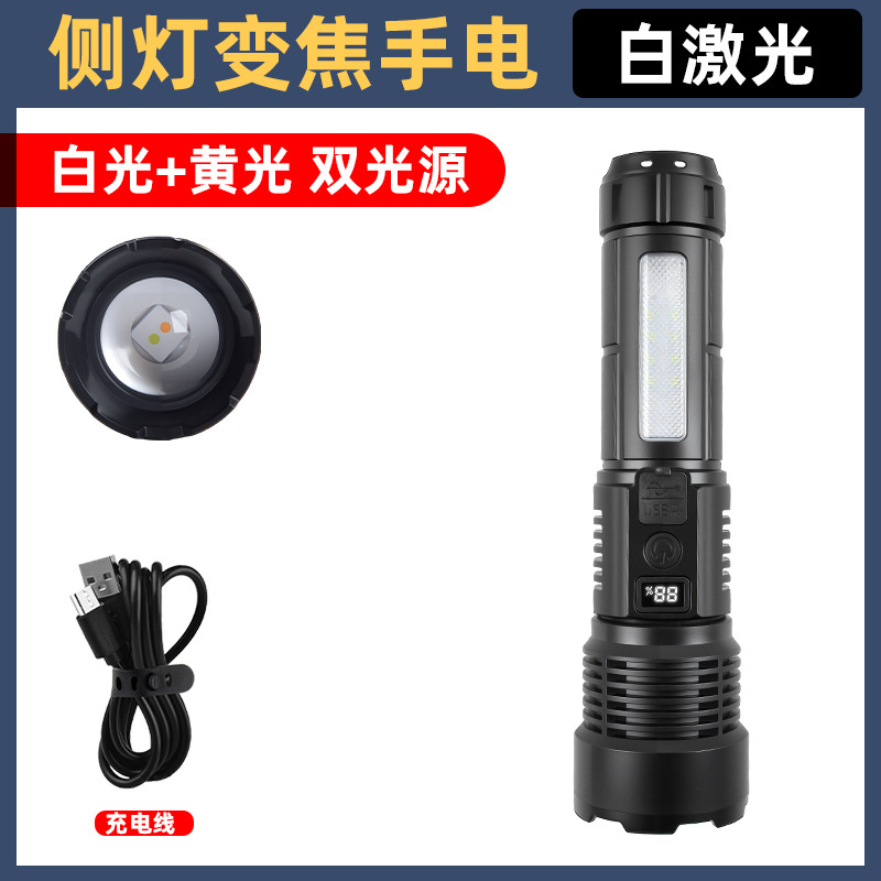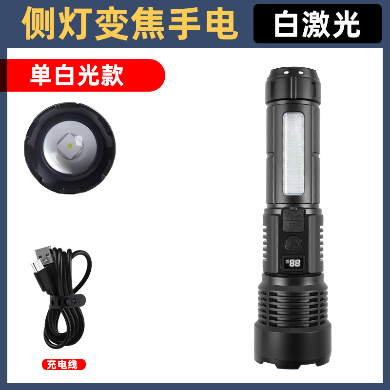 Cross-border white laser high-intensity flashlight, USB charging, telescopic focusing, ultra-bright long-range COB side light flashlight, outdoor