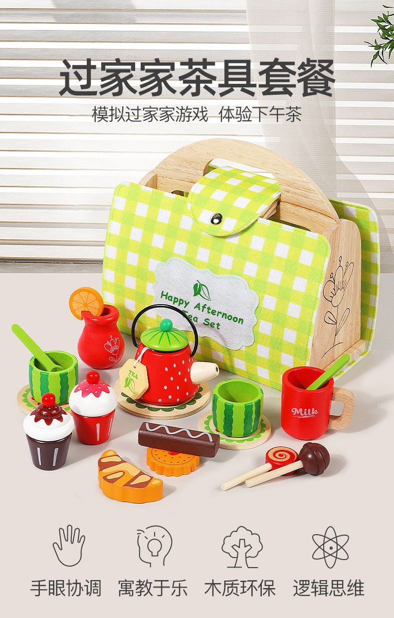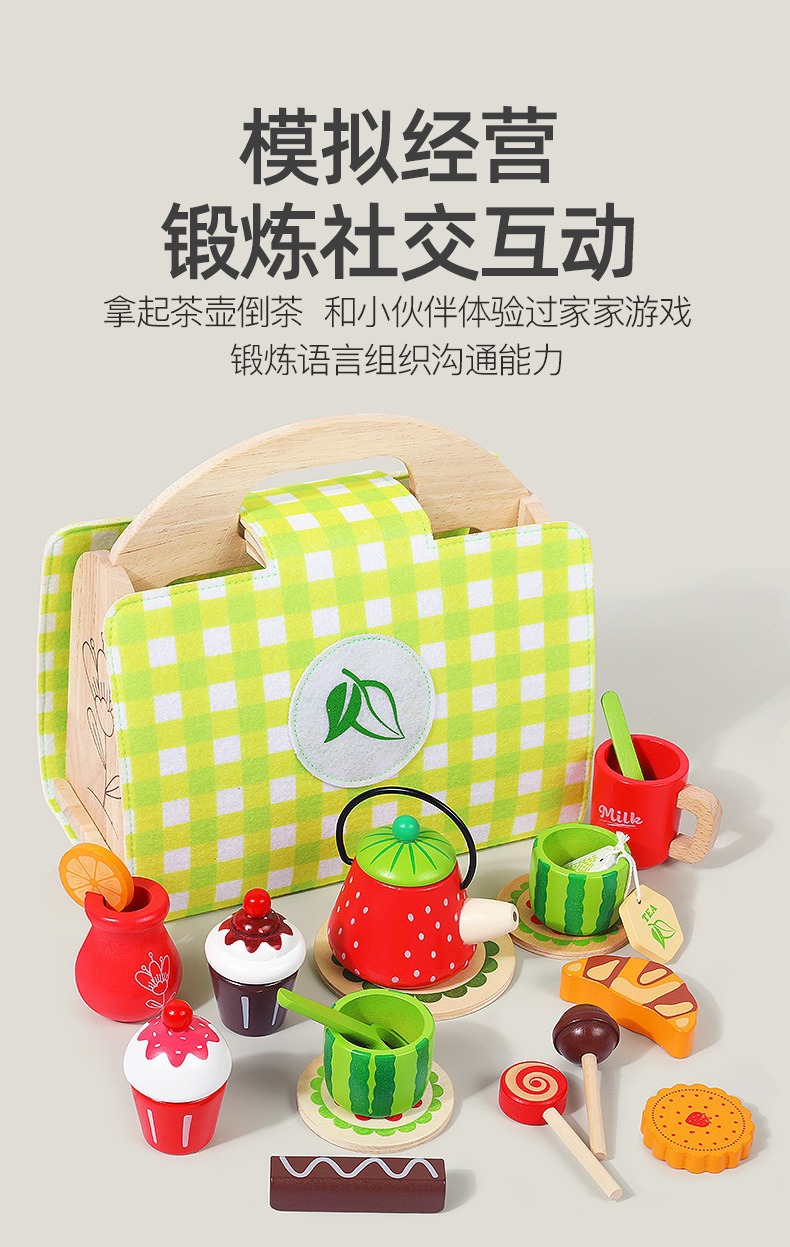 Cross-border wooden children's afternoon tea dessert simulation tea set, hand-held box, baby role-playing educational toy