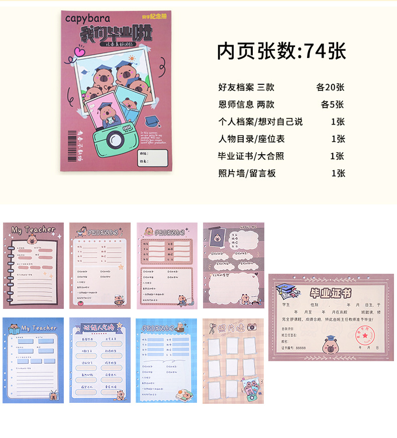 Cute Capibara Primary School classmate directory, customized graduation commemorative album, message book, children's growth contact list