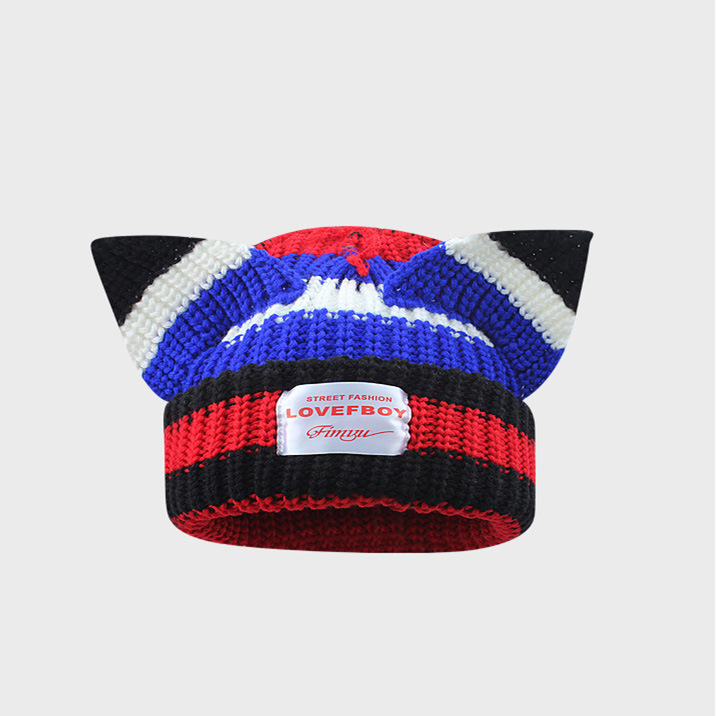 Cute cat-ear woolen hats with contrasting colors for autumn and winter, thickened and warm knitted hats for children, and ear-protecting pile hats