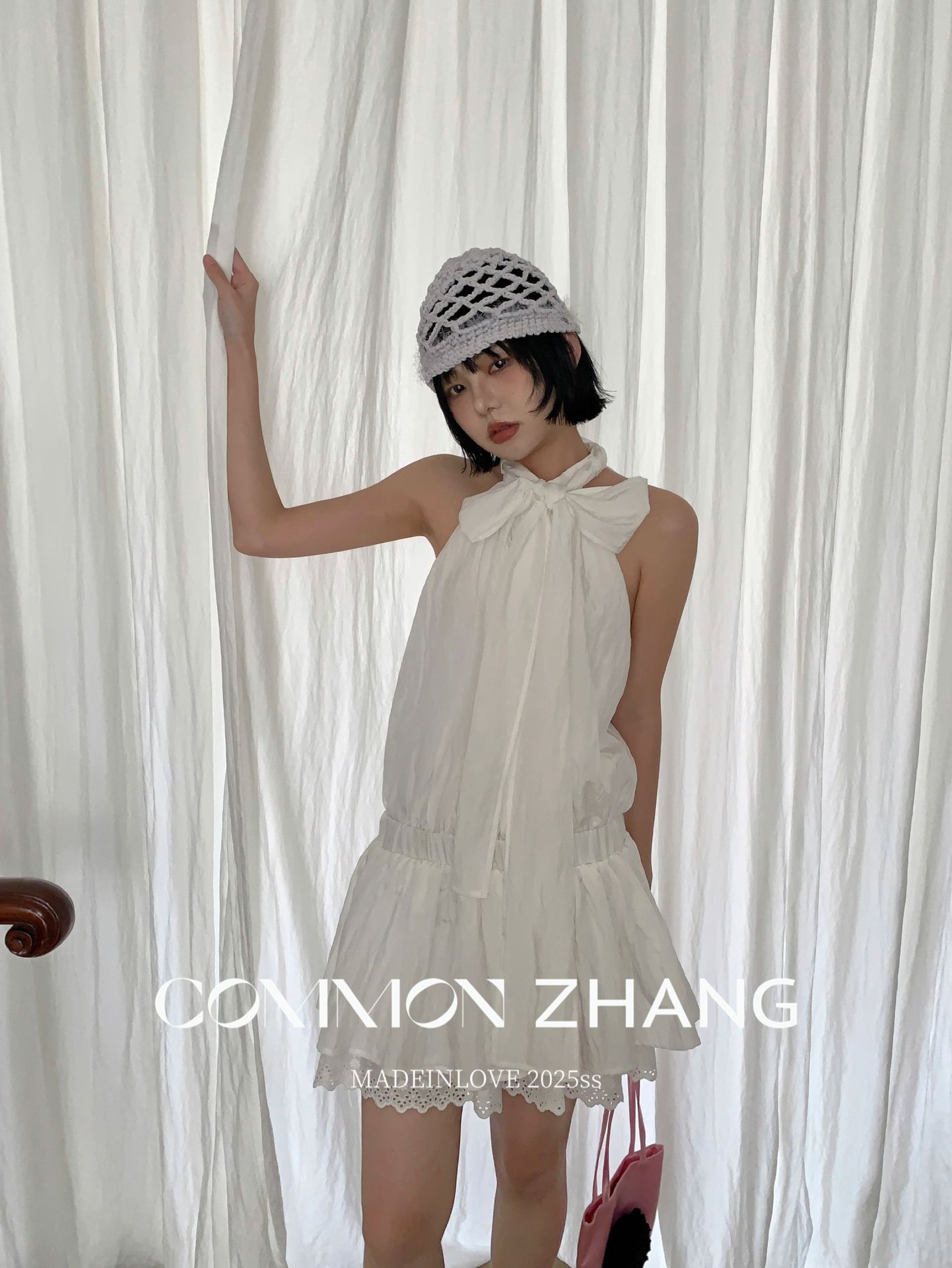 CZ ZHANG Summer French-style sleeveless halter, petite, cinched waist, lace patchwork dress for women B26647