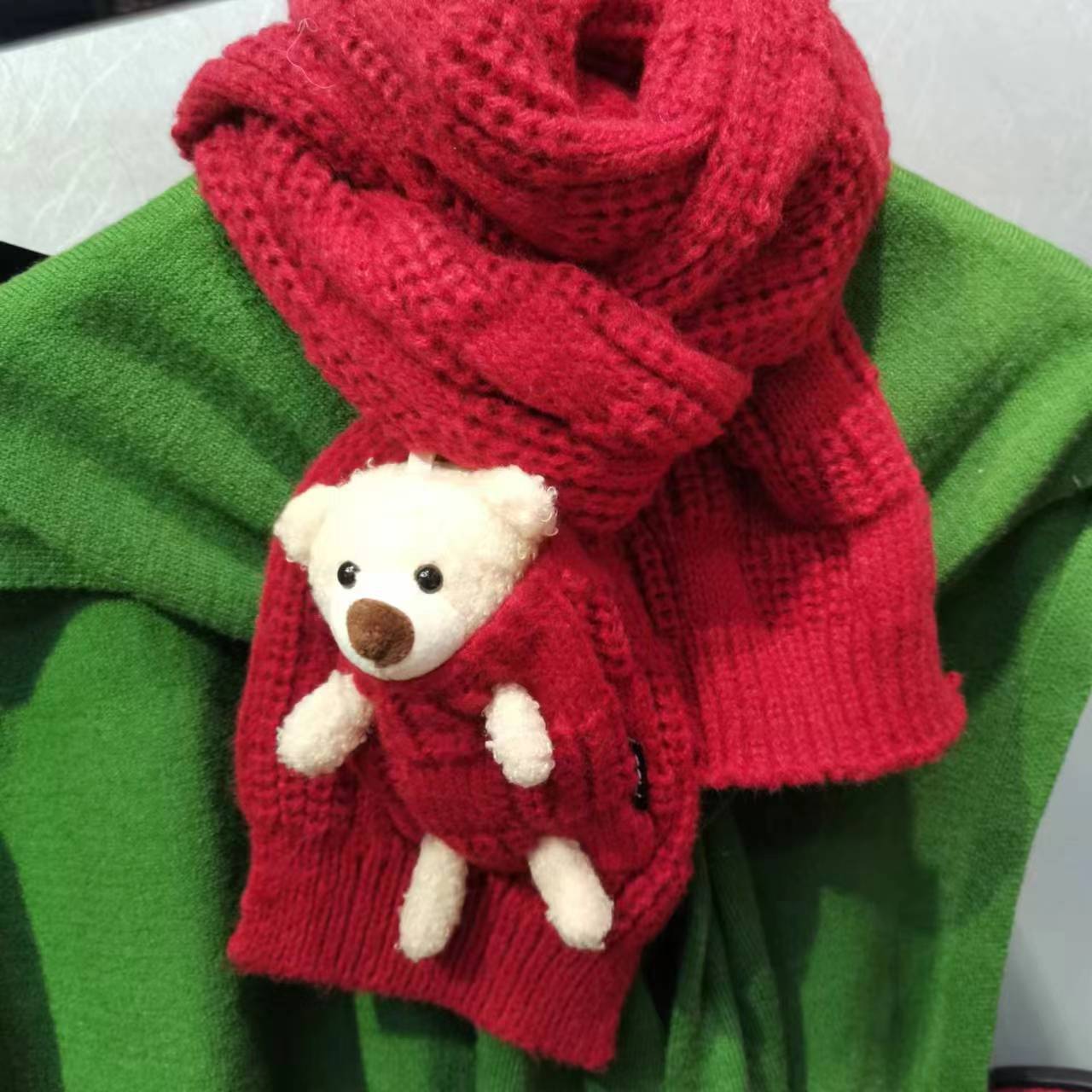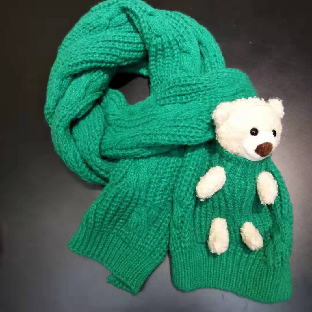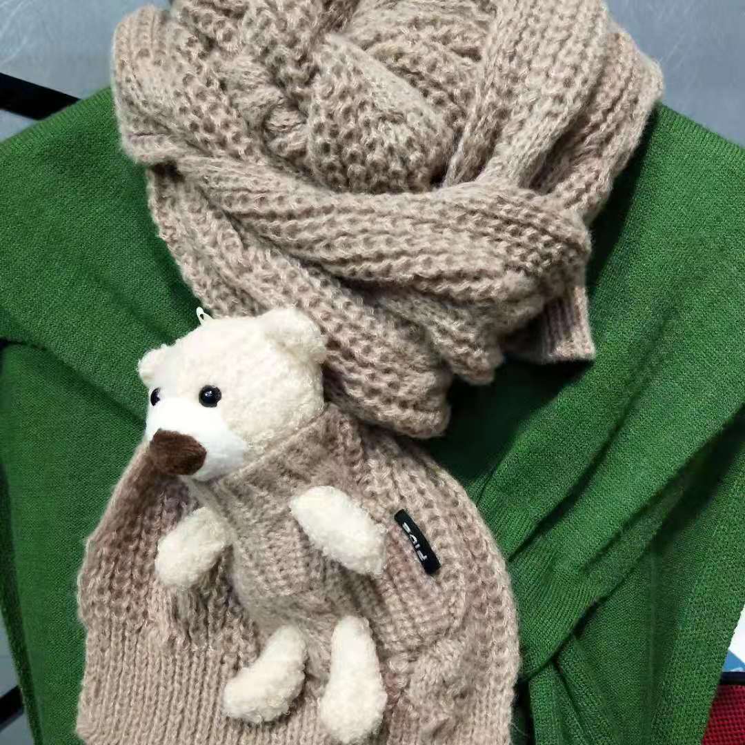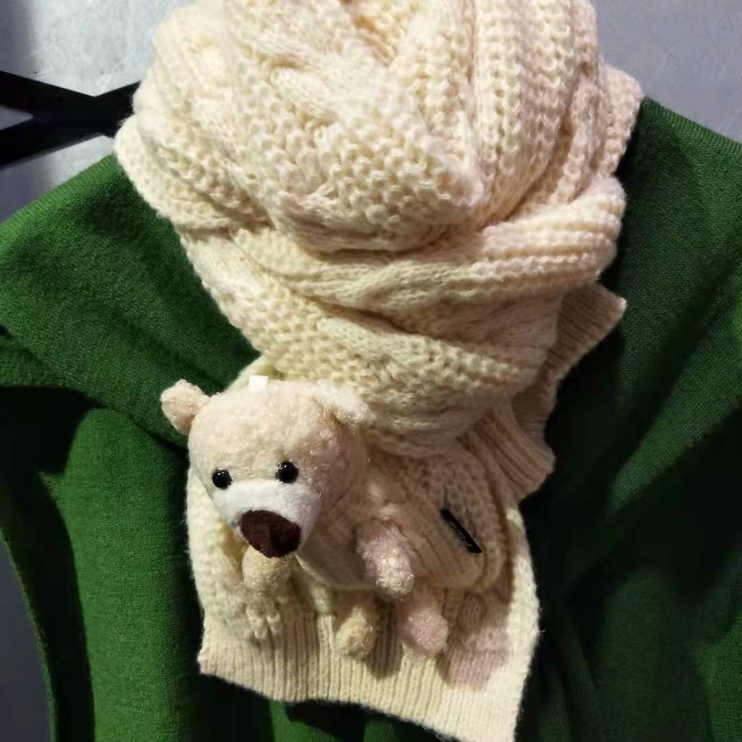 Detachable pocket Kawaii Bear scarf, cute and sweet Korean version woolen knitted scarf for girls, warm for students in autumn and winter