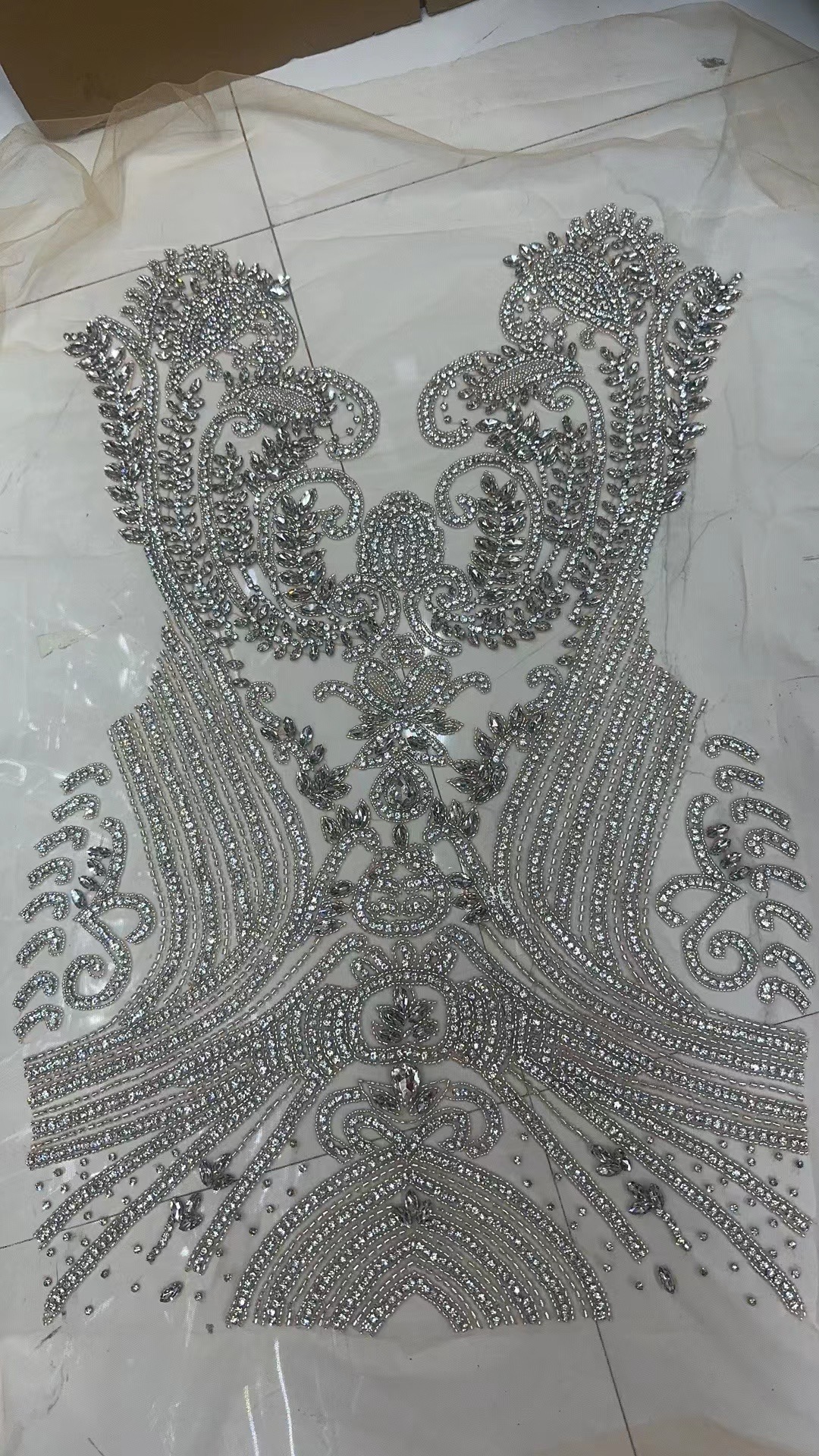 DIY hand-beaded wedding dress with deep V-neck decals and water diamonds