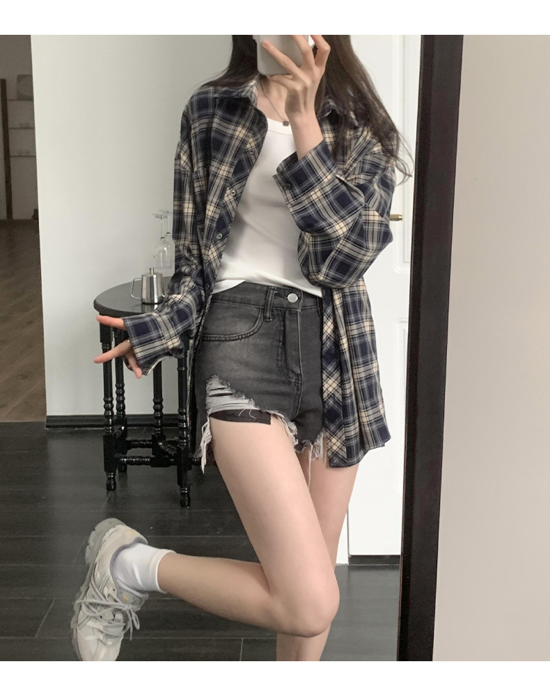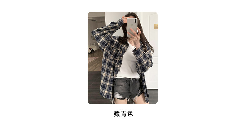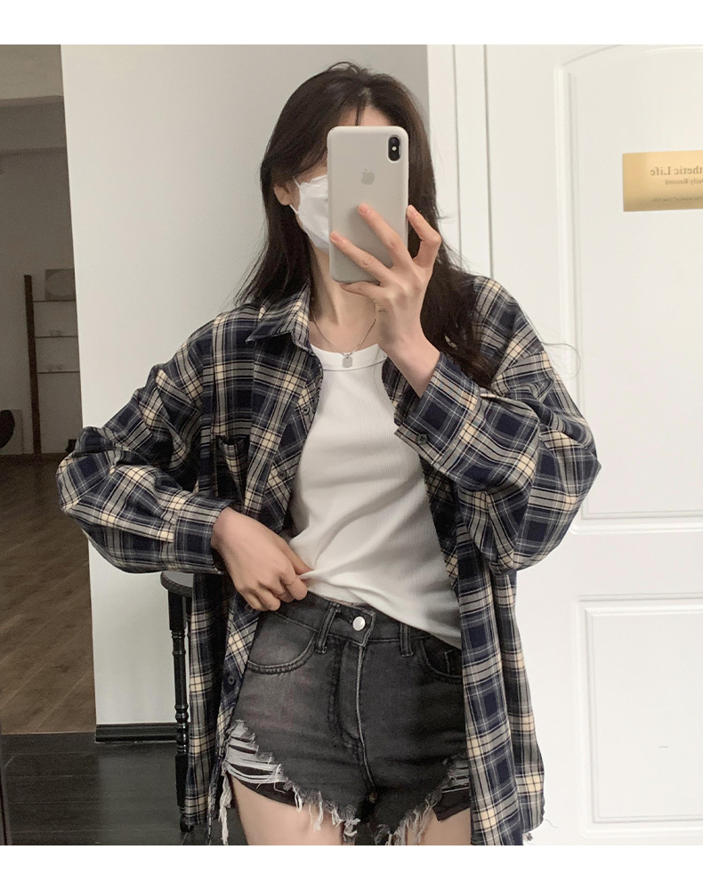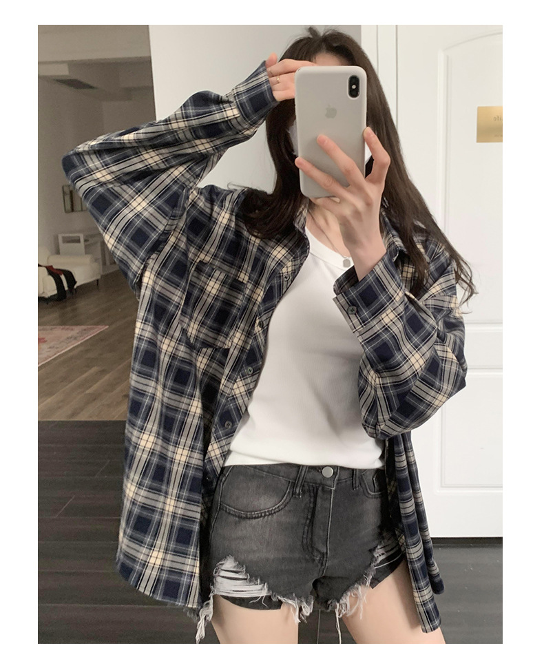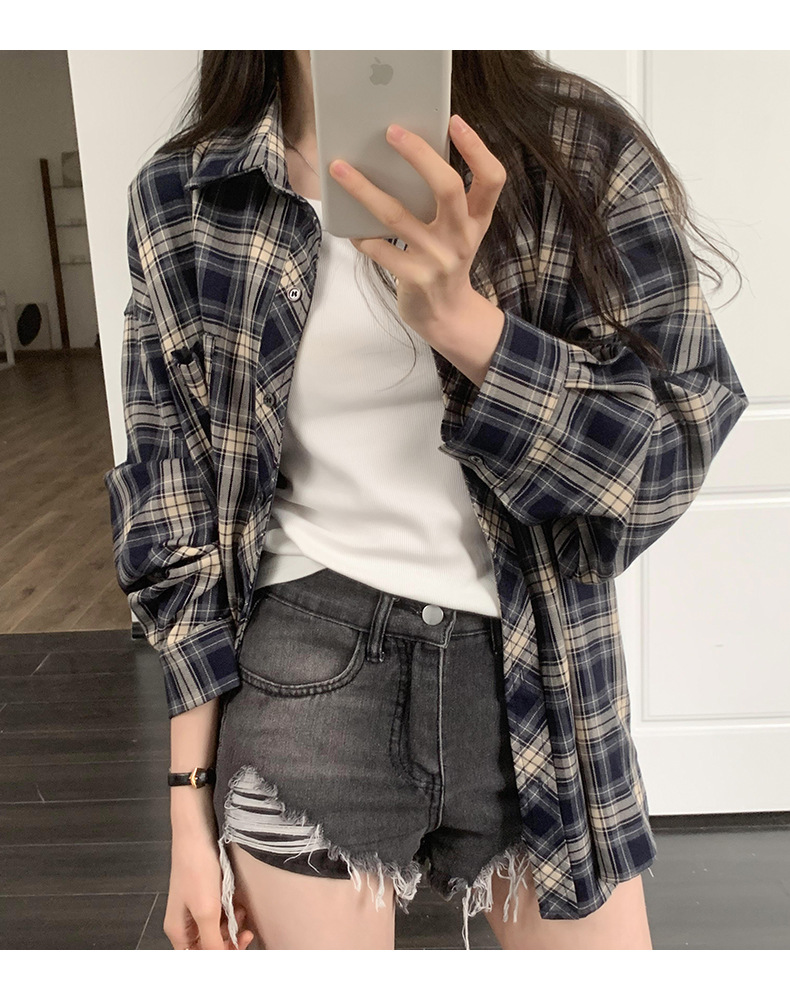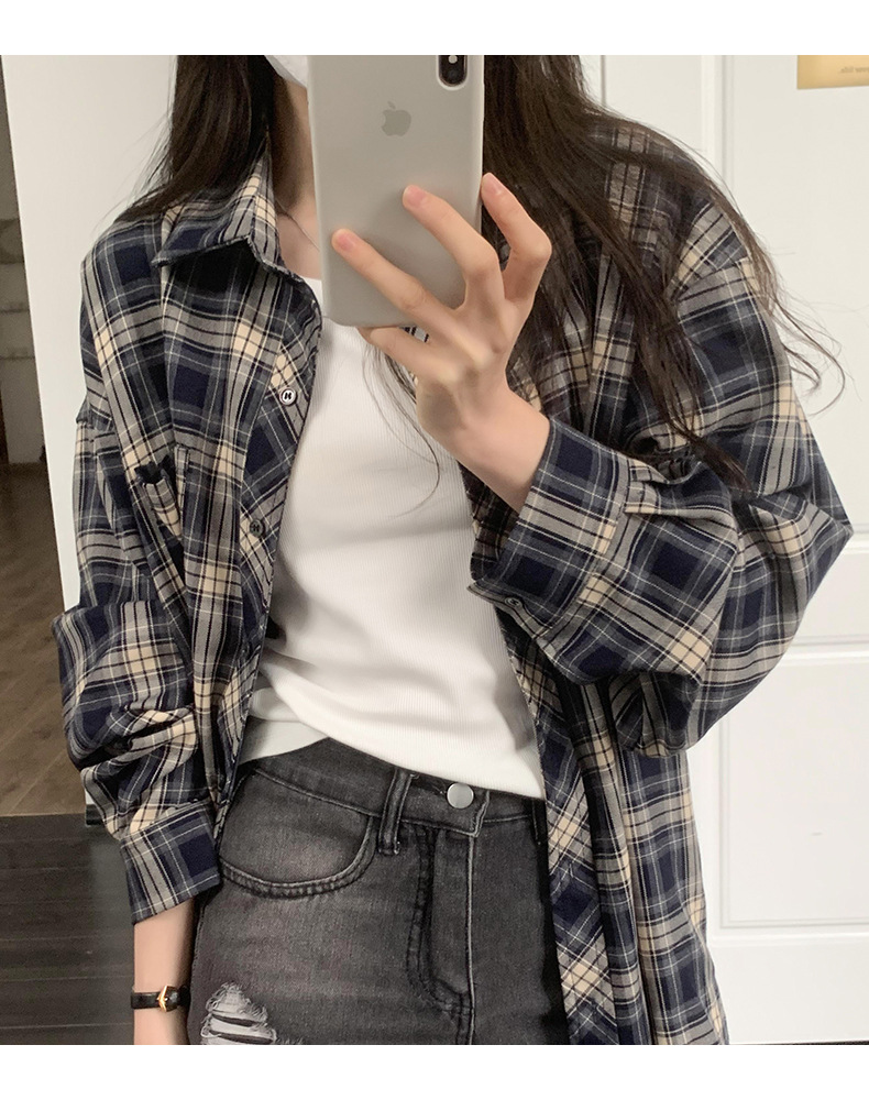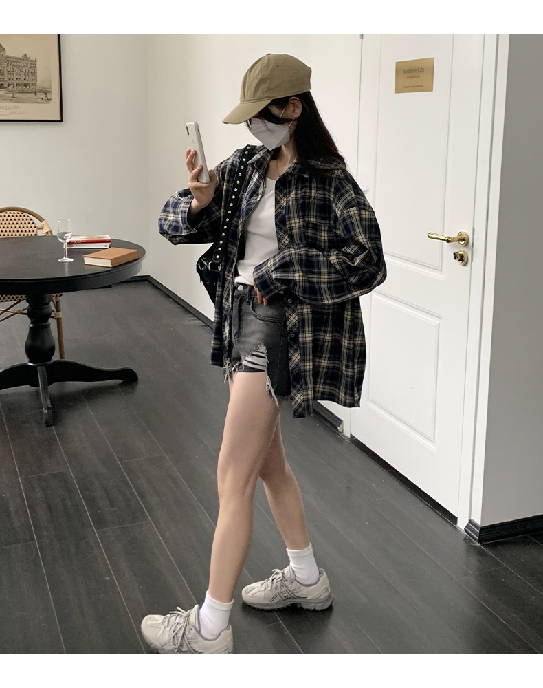 Dongdaemun, South Korea, offers a trendy 2023 autumn collection of women's wear with a loose lapel and thick checkered long-sleeved shirt