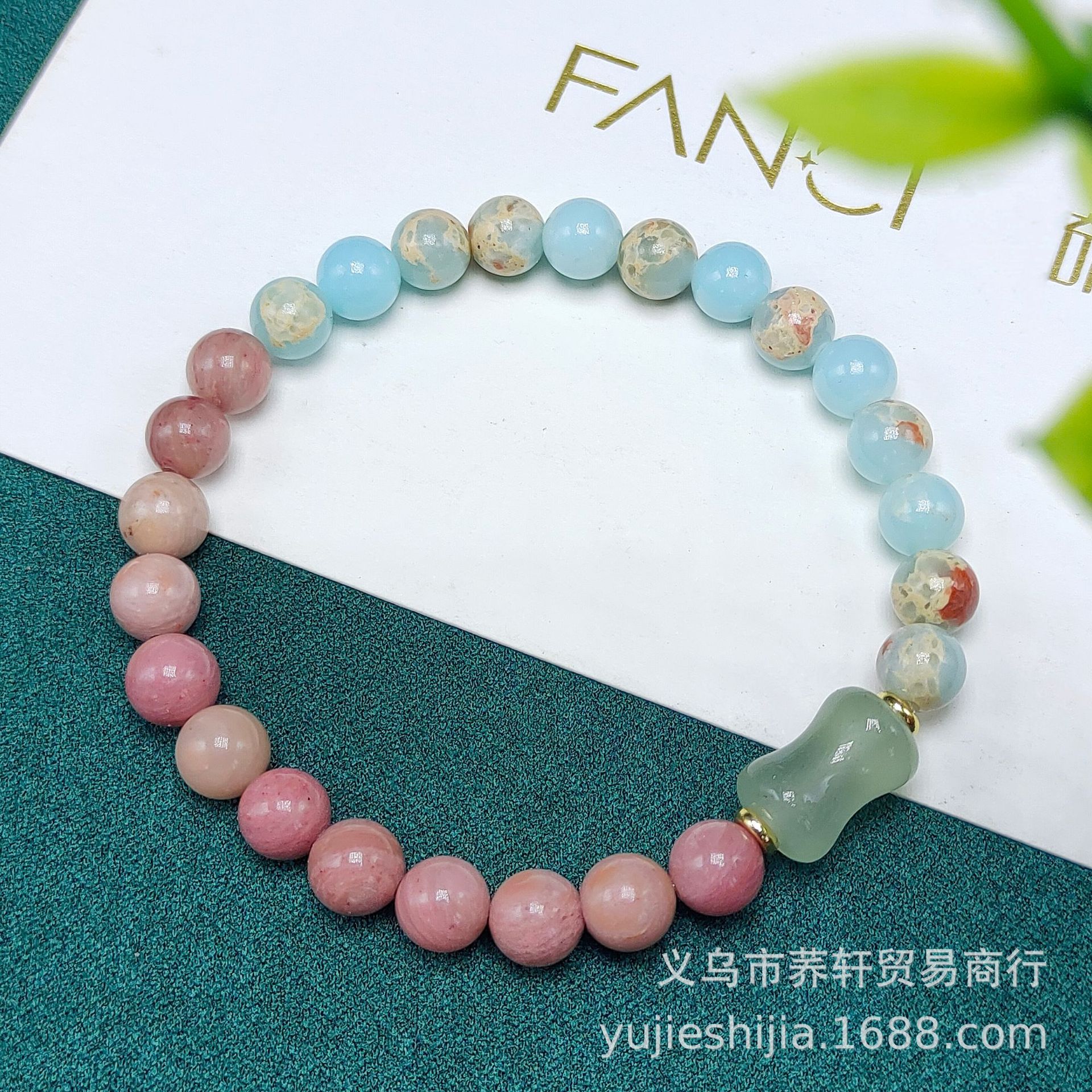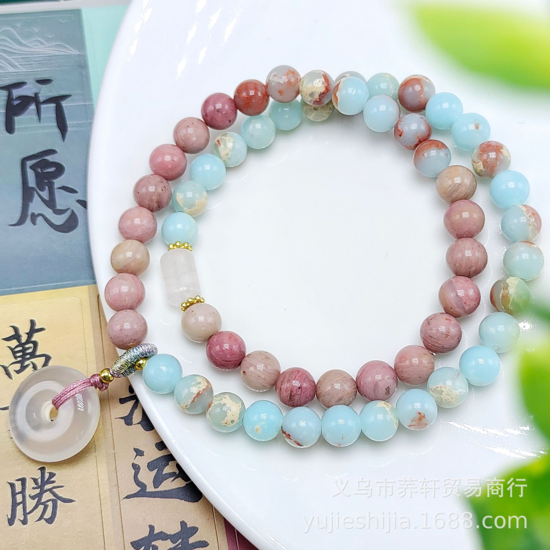 Double-ring natural stone bracelet, red wood grain stone with rose crystal lotus pod and pink rose. Red pattern stone bracelet for girls, with a sense of sophistication