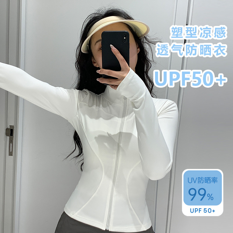 White yoga wear, stand-up collar sun-protective clothing for women, breathable, fashionable, tight and UV-resistant with UPF50+ for outdoor sports