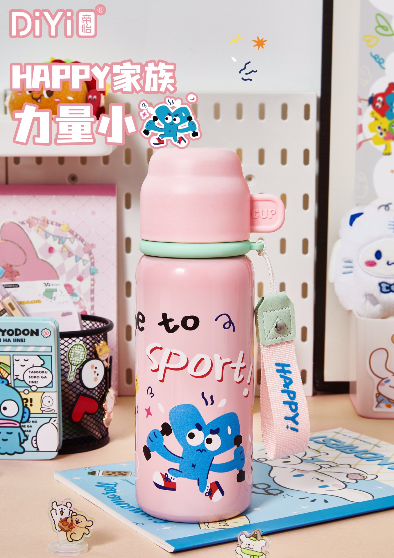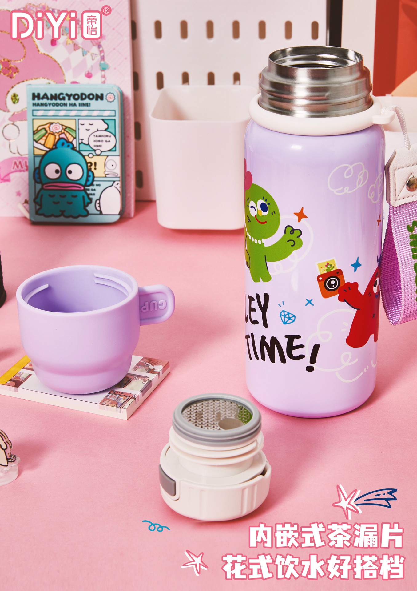 DY-BW1123 Diyi happy Family Insulated Cup, one cup for three drinks, double drink inner stopper + bowl lid Original happy letter illustration, youthful and energetic!