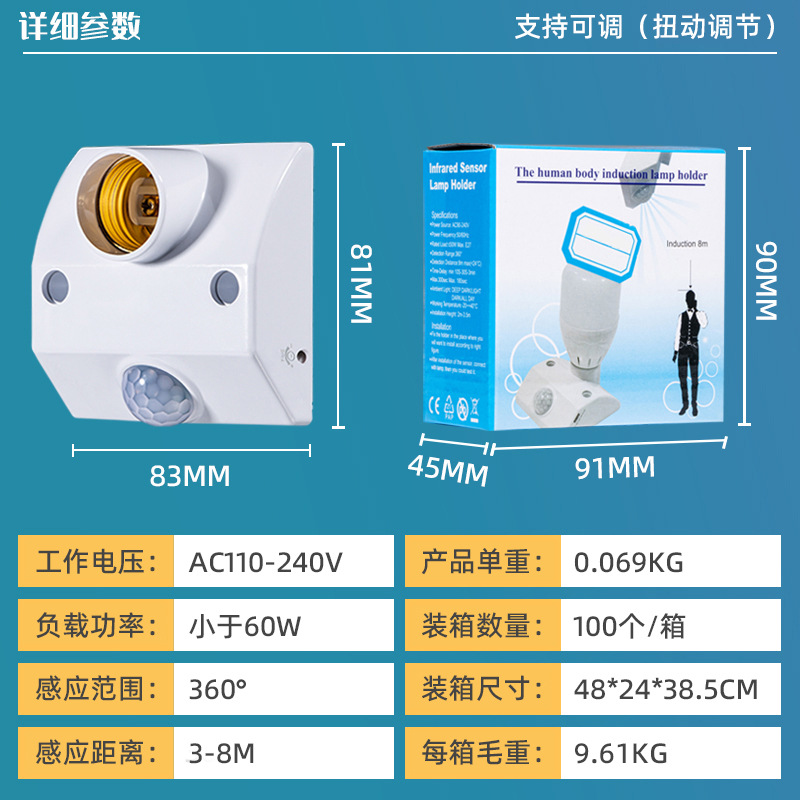 E27 screw-type intelligent sensor switch, infrared human body sensor lamp base, corridor delay lamp head, exposed lamp base