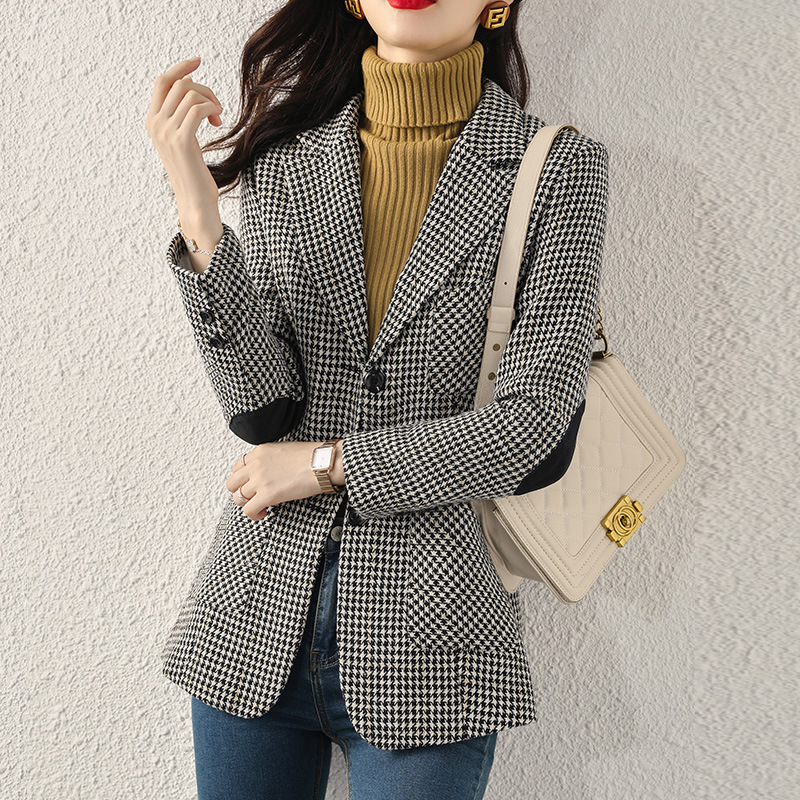 Early autumn Japanese-style checkered mid-length coat for women, slimming and fashionable checkered suit, three-pocket small suit for women