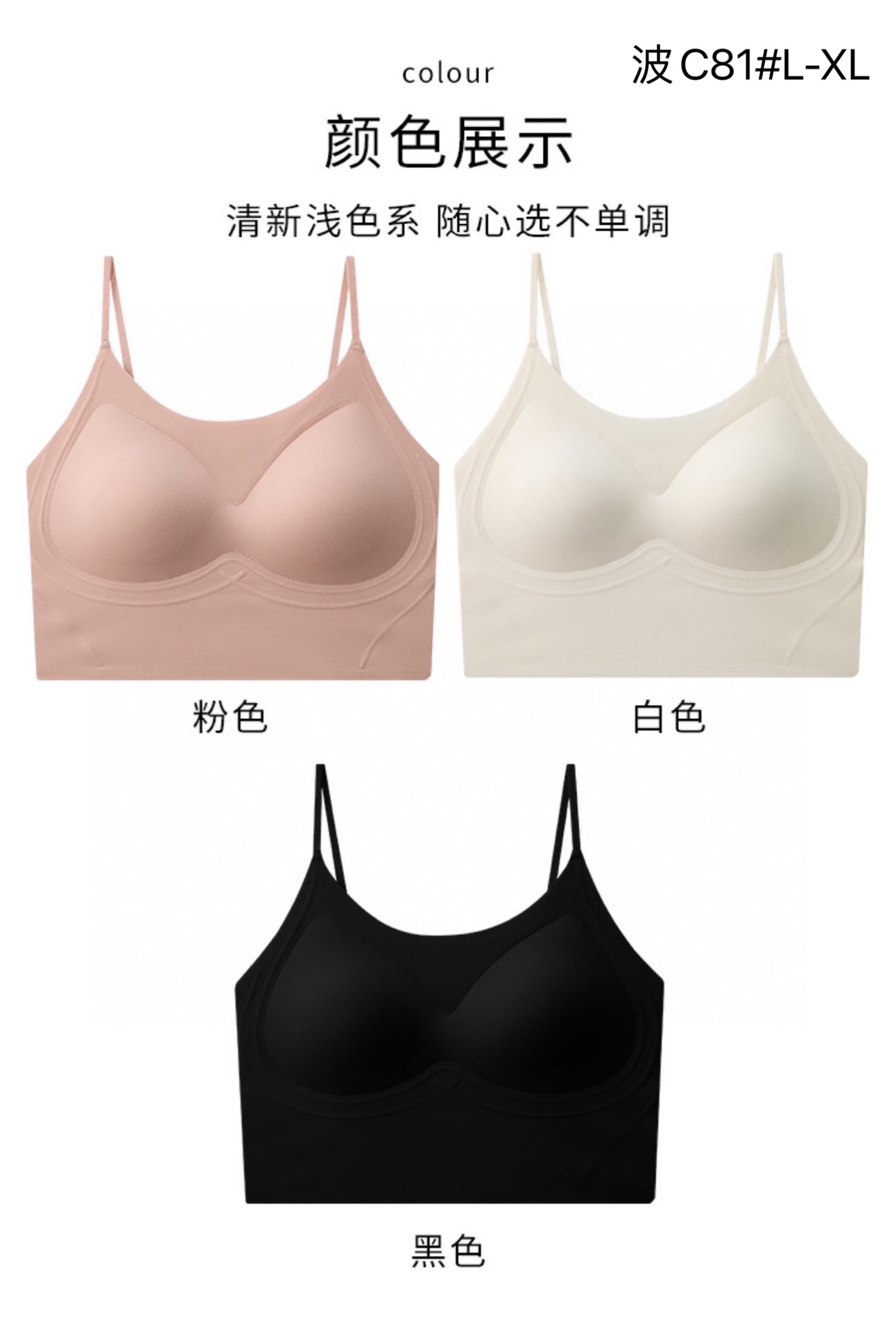 C81# Early Autumn Jelly Strip Invisible and Seamless Suspension Strap Color: Pink skin/Champagne white/Black Fabric: 66.4% nylon 33.6% Spandex Lining: 66.4% nylon 33.6% Spandex Size: L (90-125 pounds) XL (125-150 pounds) Autumn is coming soon! This is a must-have companion for early autumn outfits. The brushed design warms your body and mind. It features a minimalist and chic cream design. The jelly lift top is a beautiful back strappy top!! The one-piece bra is made of more practical brushed close-fitting fabric, perfect for early autumn