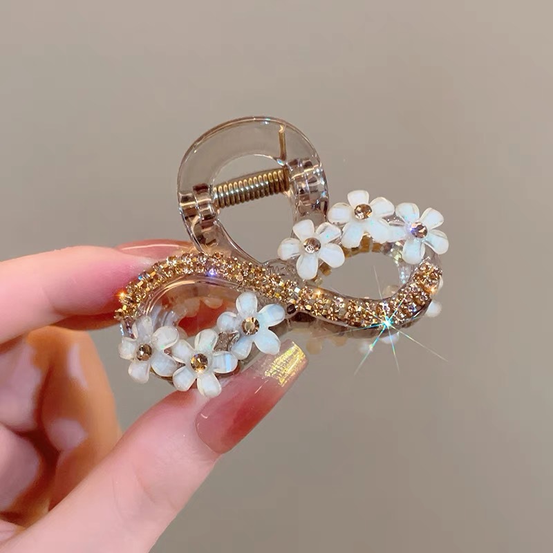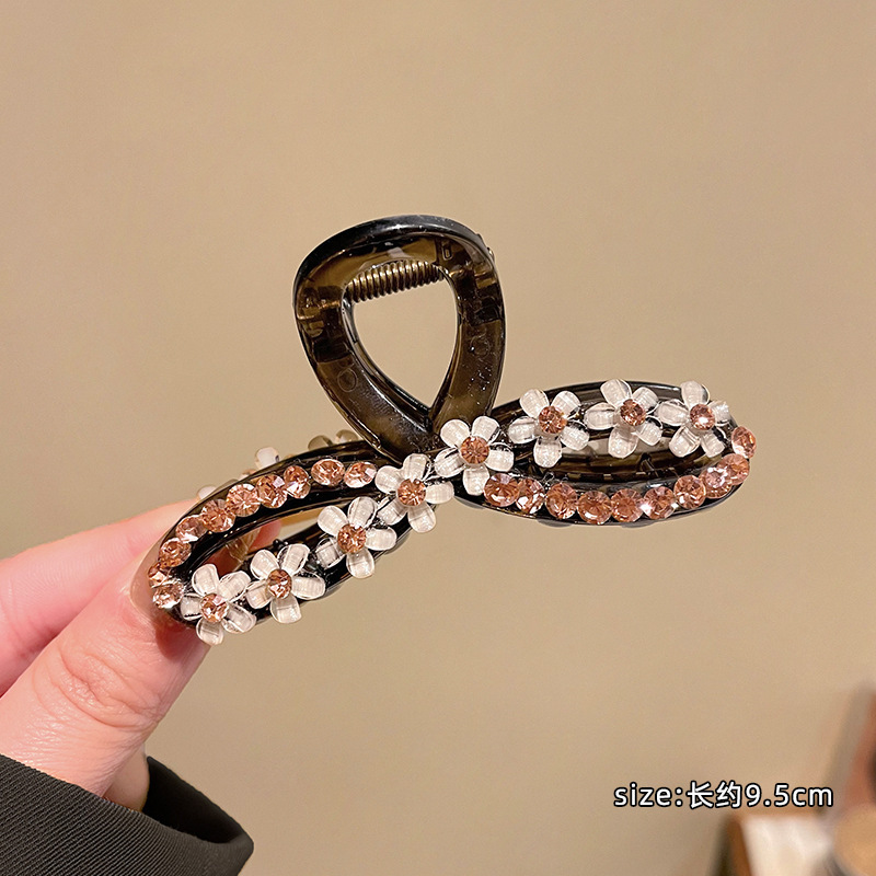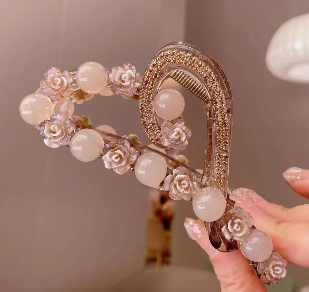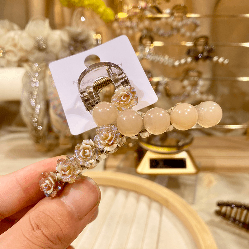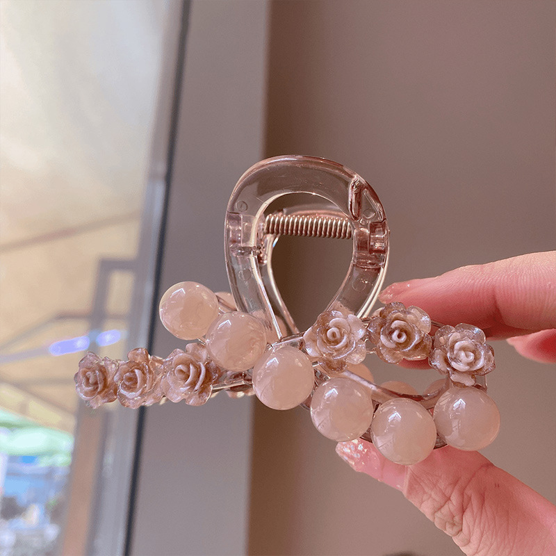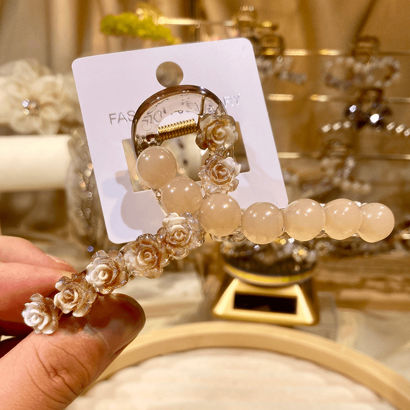 Elegant little camellia flower bead claw clip, large hair volume, high-end updo shark clip for women at the back of the head