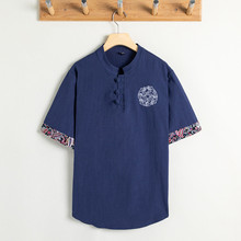 | Chinese-style embroidered button-up cotton and linen short-sleeved T-shirt for men, thin top, large-sized Tang suit, loose men's T-shirt, half-sleeved |