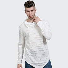 | This is a trendy men's casual long-sleeved T-shirt with a European-sized personality, a pockhole collar and a large inverted triangle hem |