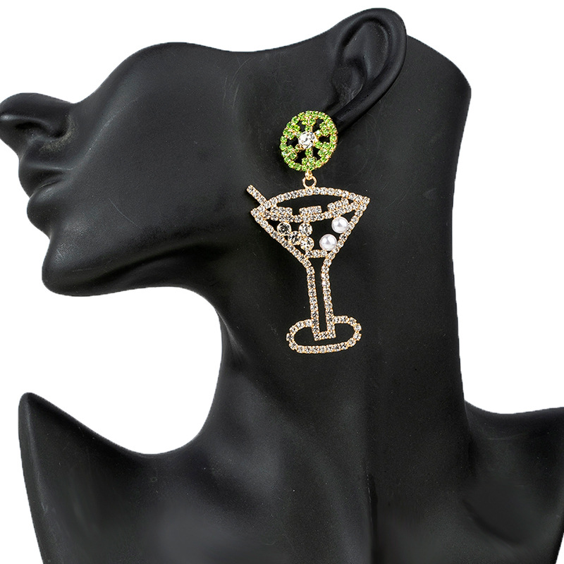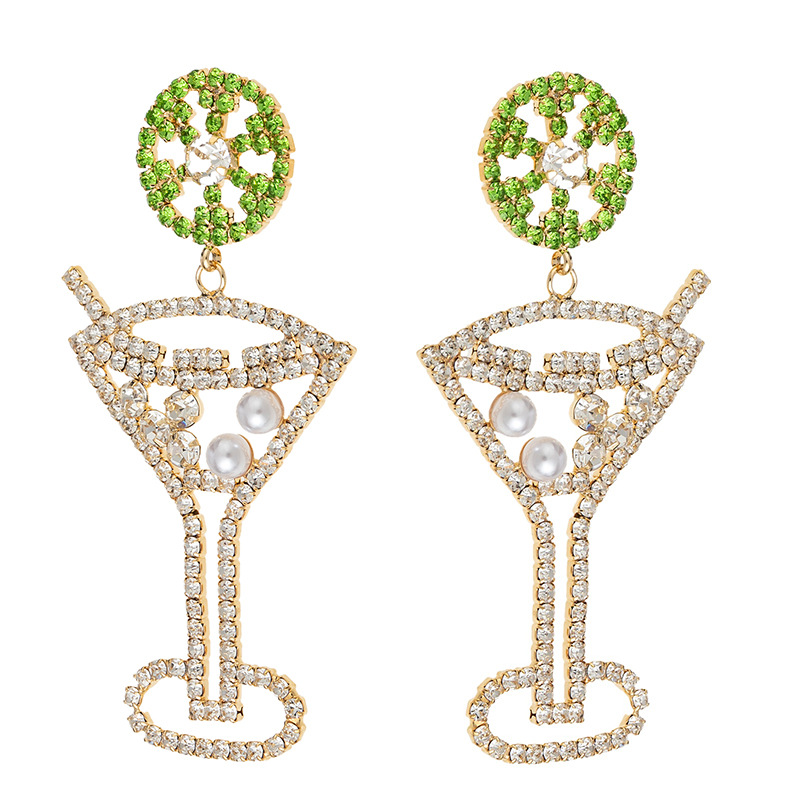 European and American cross-border carnival party earrings, diamond-encrusted pearl wine glass-shaped earrings, design sense, green rhinestone pendants, highball cup earrings, simple and elegant women's wholesale