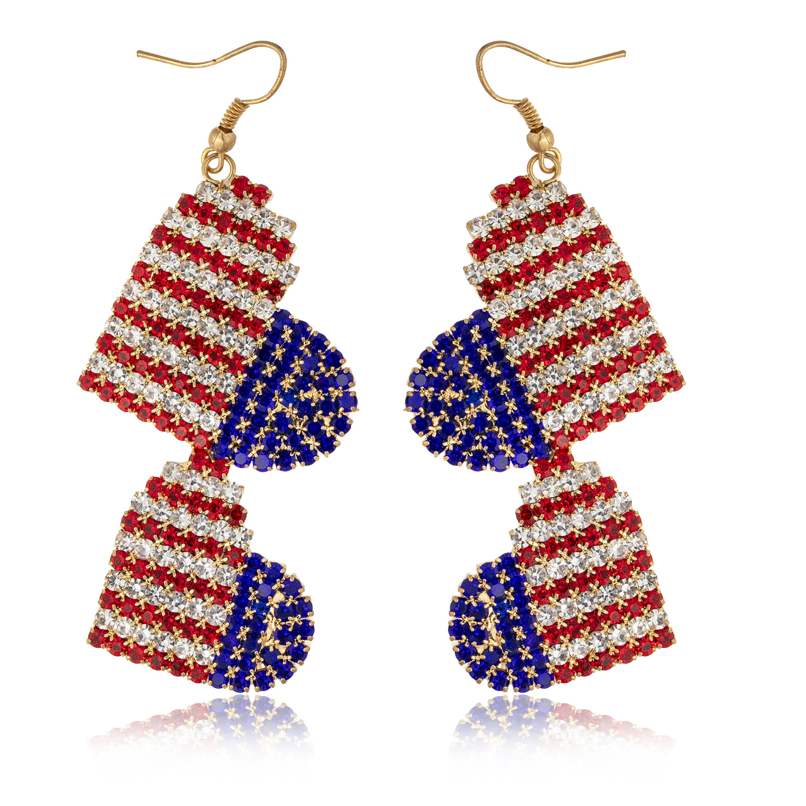 European and American cross-border heart-shaped earrings, American flag color water diamond double-layer heart-shaped earrings, women's claw chain jewelry pendant, long and simple full-diamond earrings
