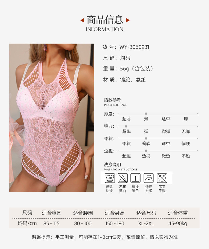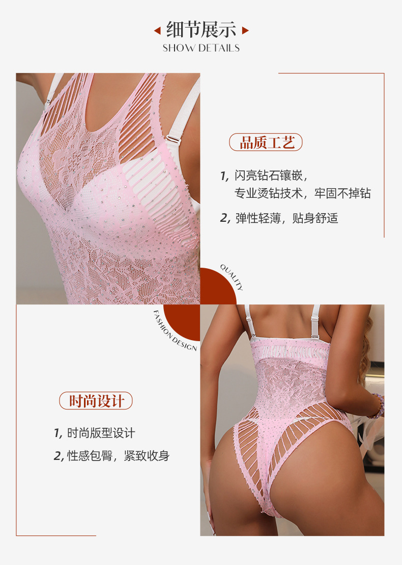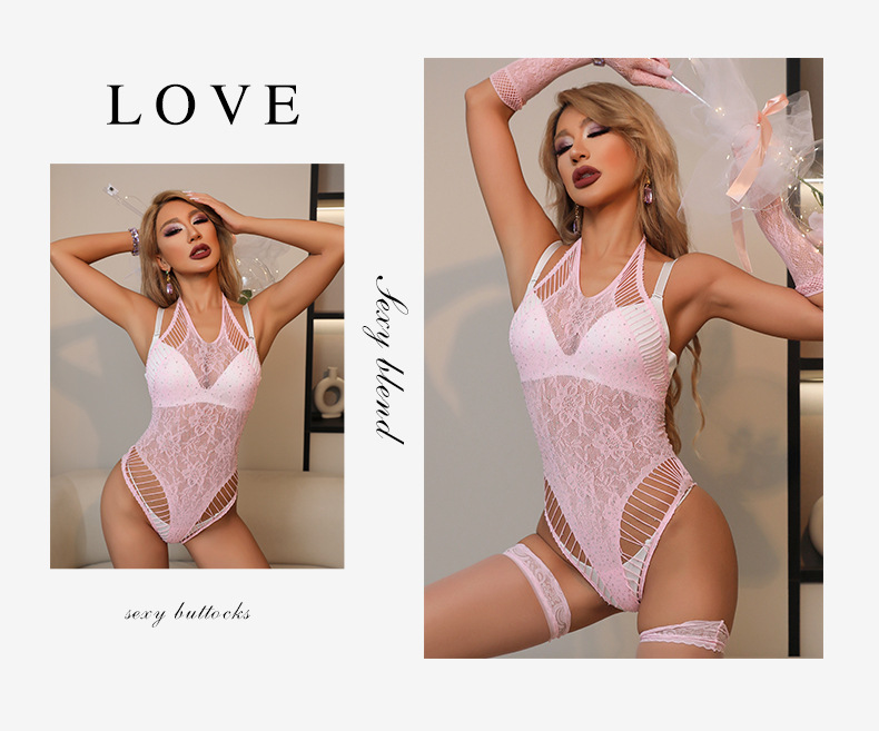 European and American cross-border stock pink women's sexy hot diamond cutout halter jumpsuit, romantic underwear hot set, net garment