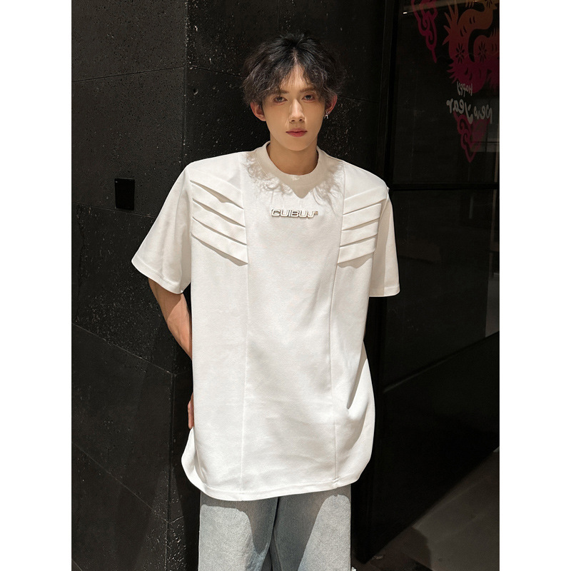 European and American high street original design sense T-shirt for men, multi-layered structure shoulder pad short-sleeved, summer American-style heavy half-sleeved