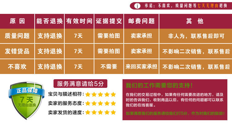After receiving the goods, please open and inspect them in front of the Courier. If you have signed for them, it indicates that the quantity, quality and other aspects of the goods are all fine. We do not accept returns or exchanges. If the package is damaged or the quantity does not match the list, please contact us as soon as possible in front of the Courier and ask the Courier to note this situation on the return waybill.