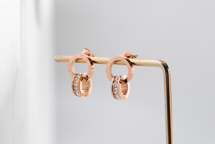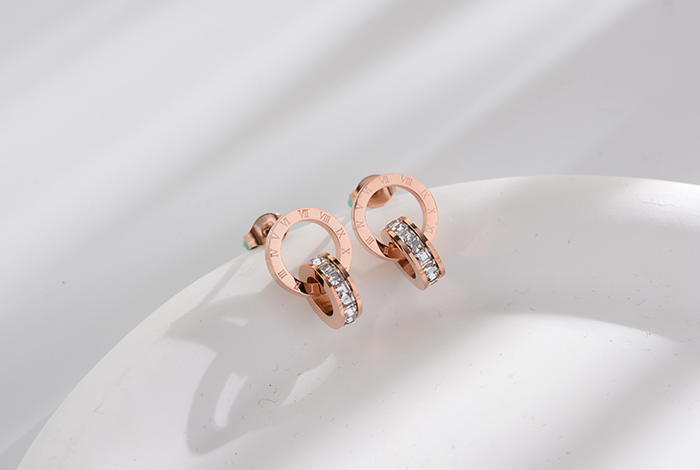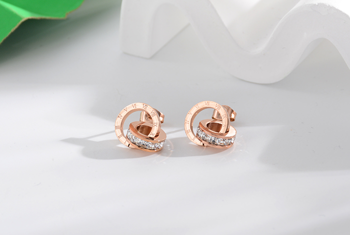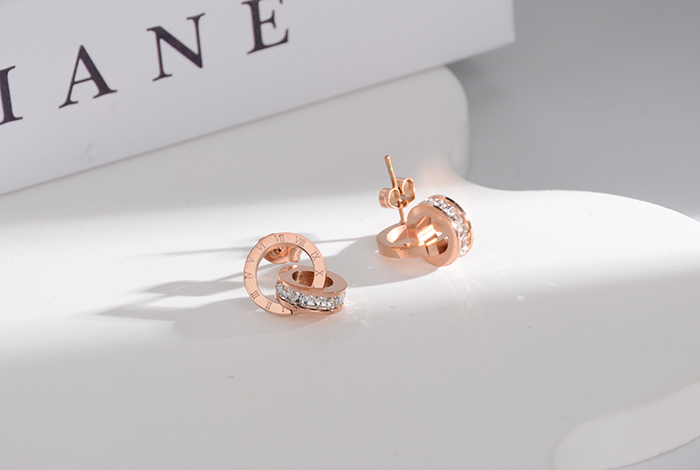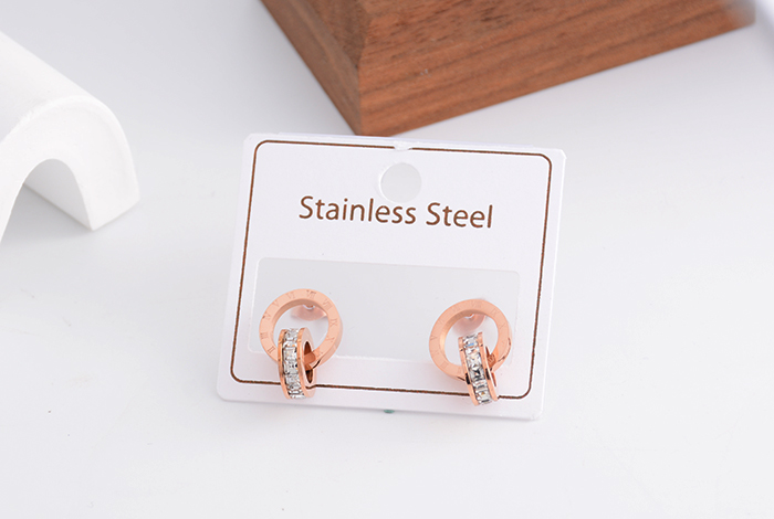 European and American style fashionable double-ring white diamond stud earrings, titanium steel rose gold diamond earrings, versatile women's accessory