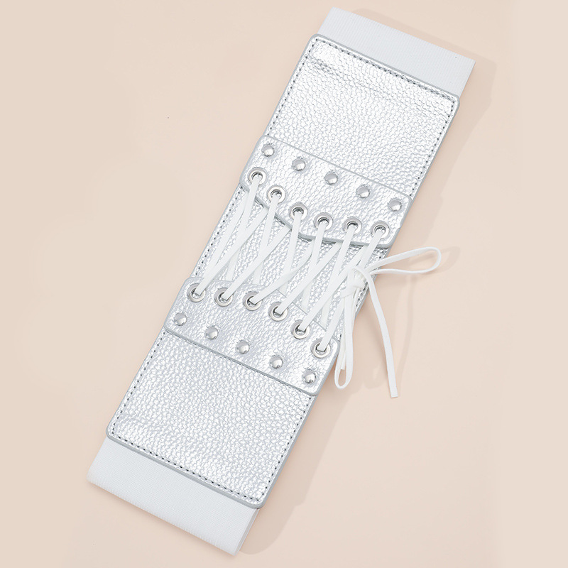 A fashionable and versatile dress with a silver metal buckle and a wide belt that is both elastic and tight in the European and American style. It features a corset and an elastic waistband for ladies