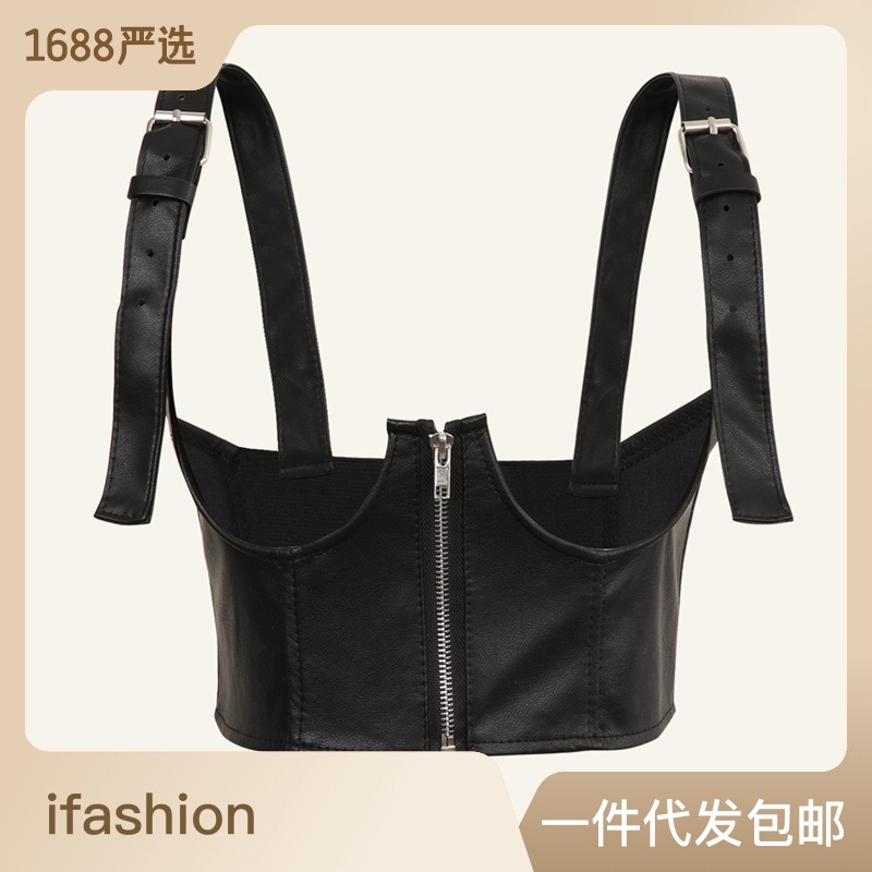 A fashionable lady's PU leather vest with elastic and elastic straps. It can be paired with a shirt and decorated with a belt and body chain