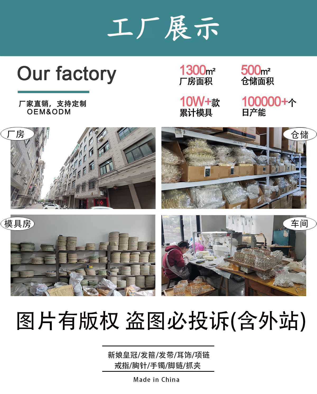 Our factory is a professional jewelry processing factory integrating research and development, production and sales. We have 14 years of rich production experience and a professional team. Our products are complete, offered at favorable prices and of superior quality. We mainly deal in various bridal crowns, hair combs, hair bands, hairpins and other headwear, necklaces and other accessories.