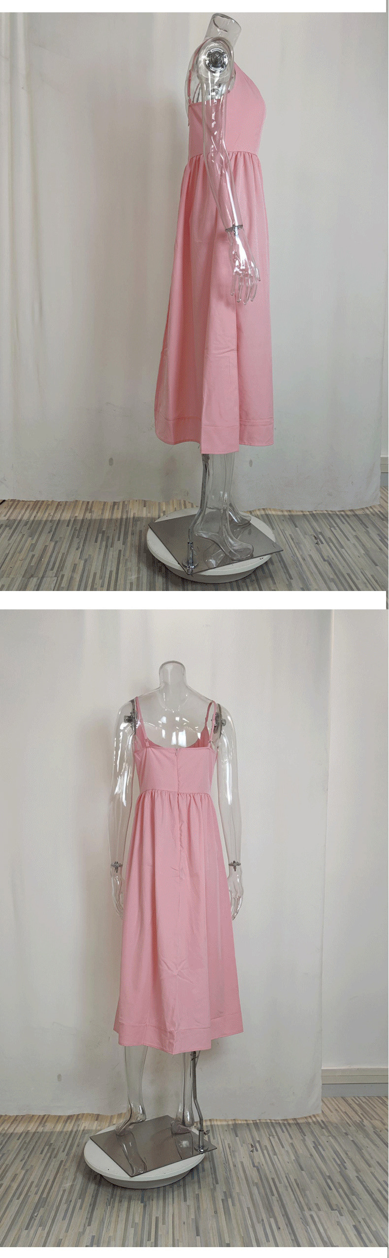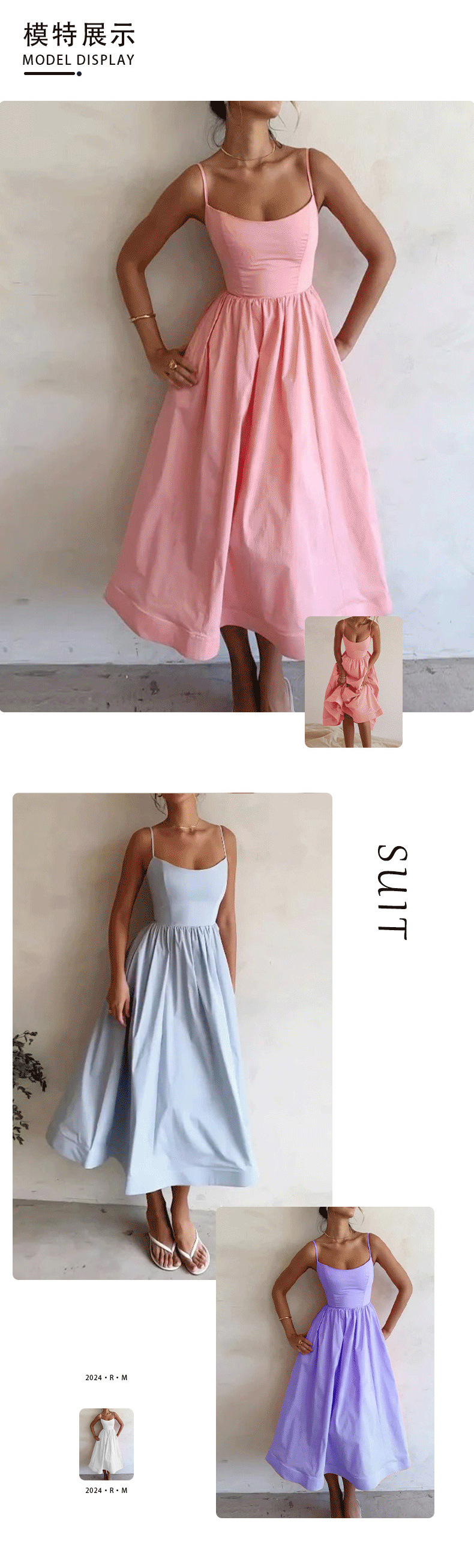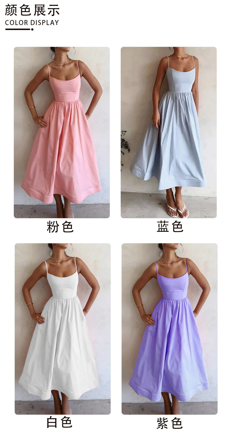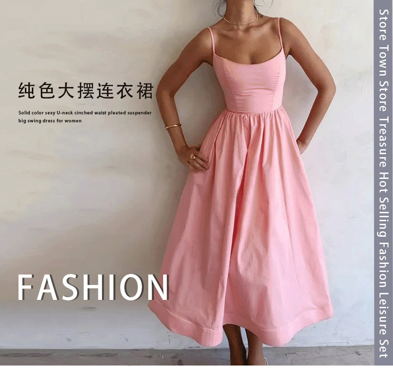European and American women's clothing 2024 Summer export new solid color sexy U-neck waist-cinching pleated halter dress for women