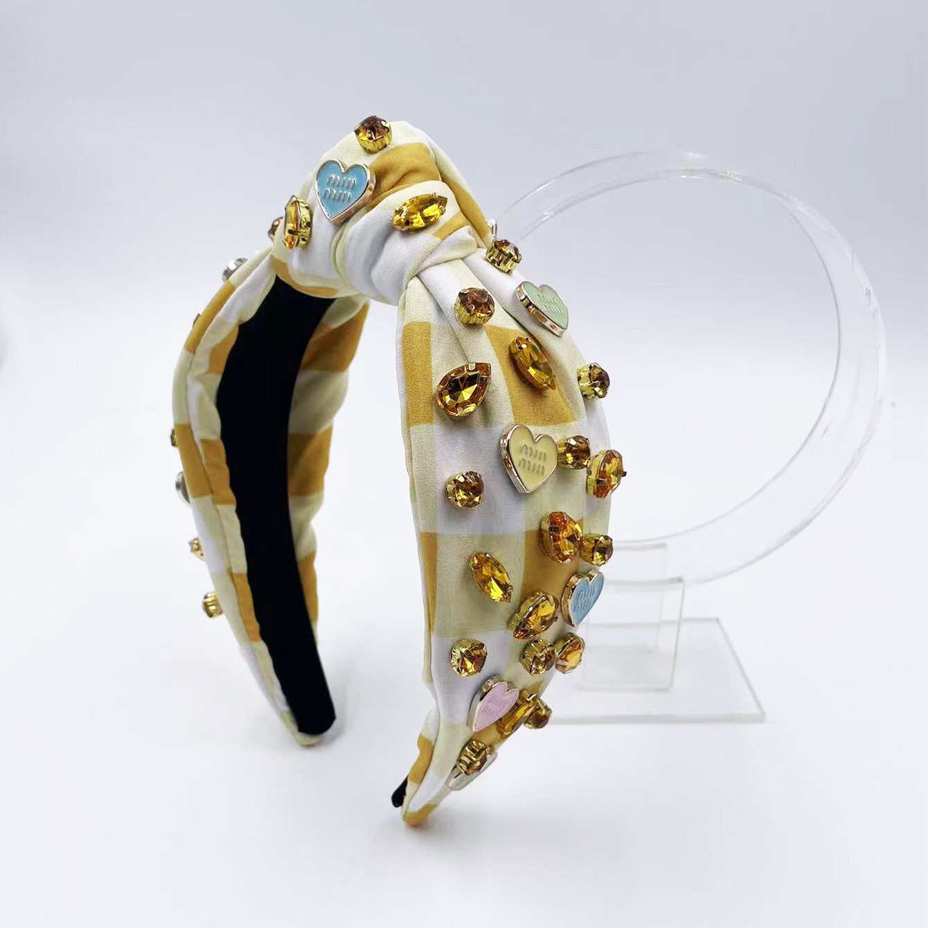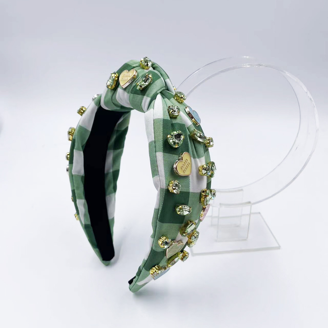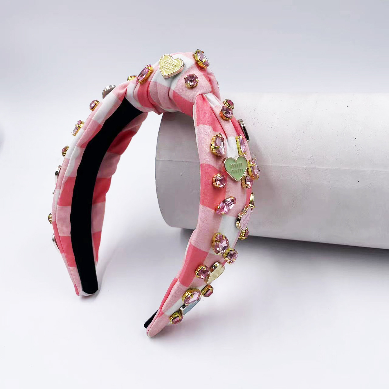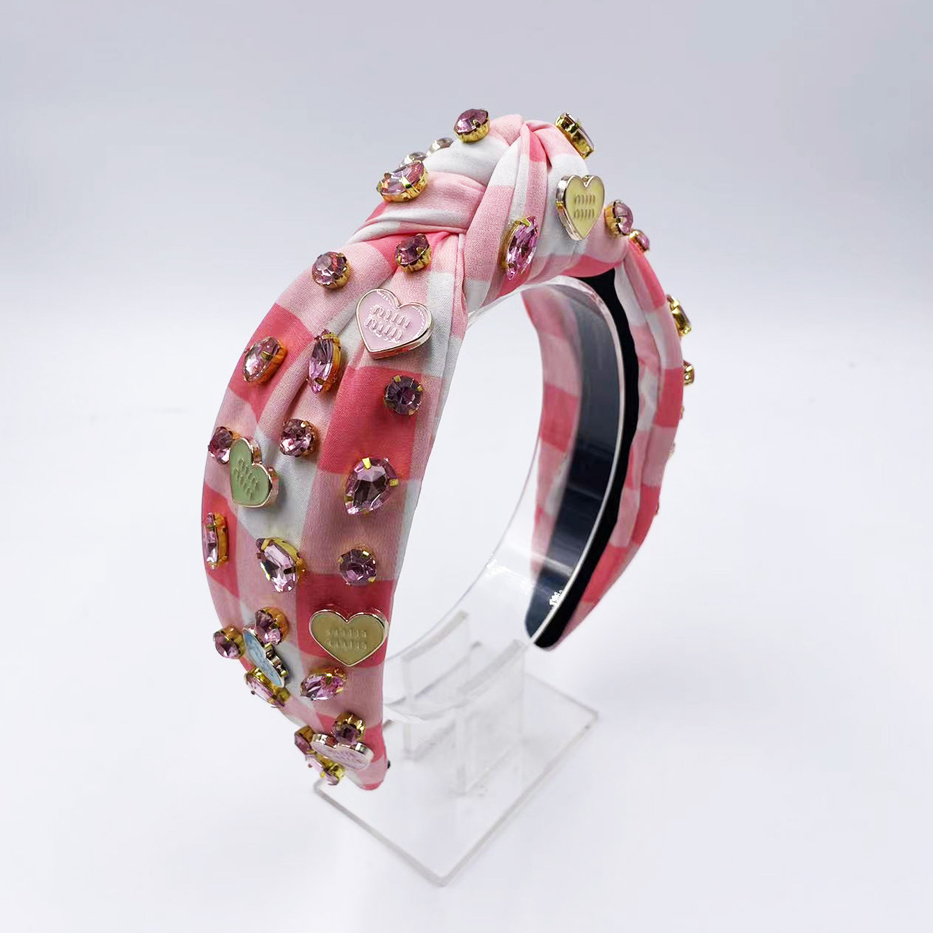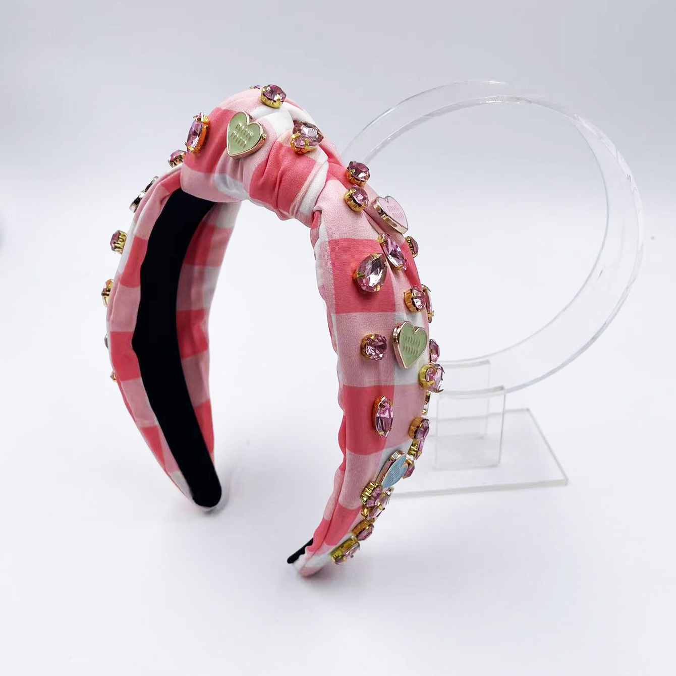 Exclusive Qiwei Accessories, Exclusive Qiwei Accessories, Exclusive original new Valentine's Day diamond-encrusted heart-shaped accessories, checkered fabric, fashionable knot, high head, sweet headband, hair band