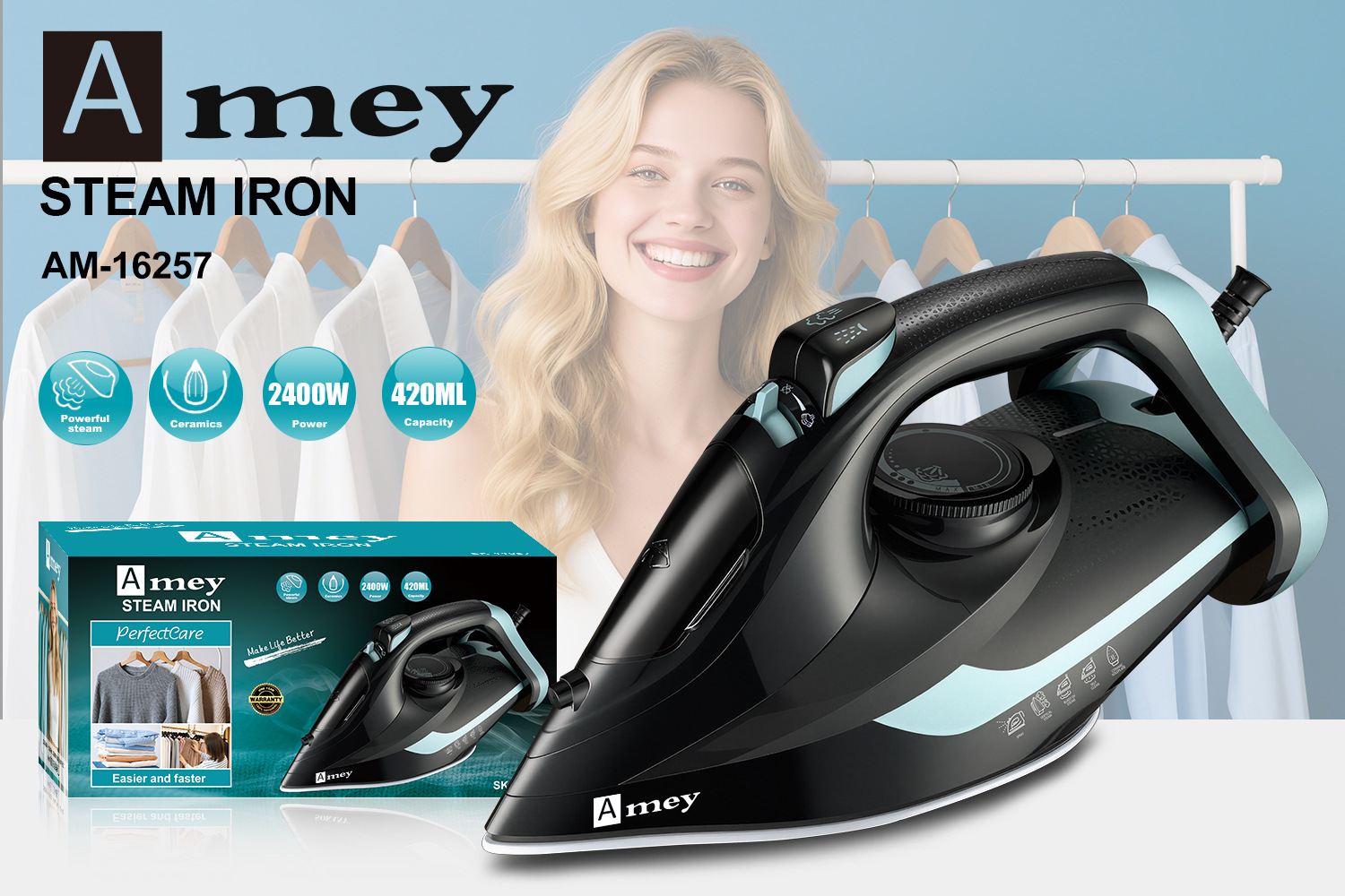 Export Amey16257 iron, household ceramic electric iron, powerful spray, quick wrinkle removal steam iron