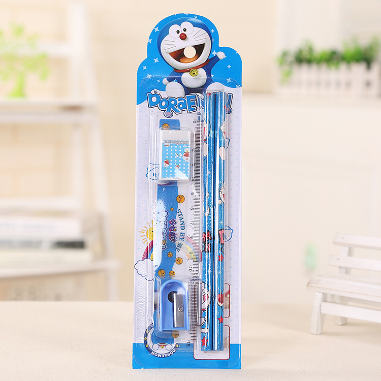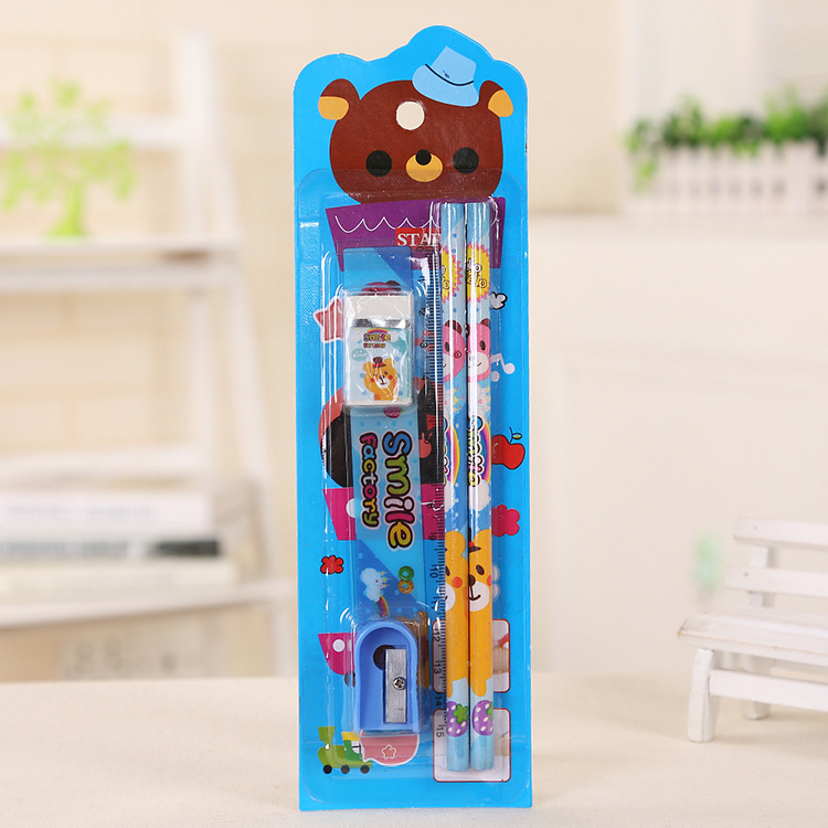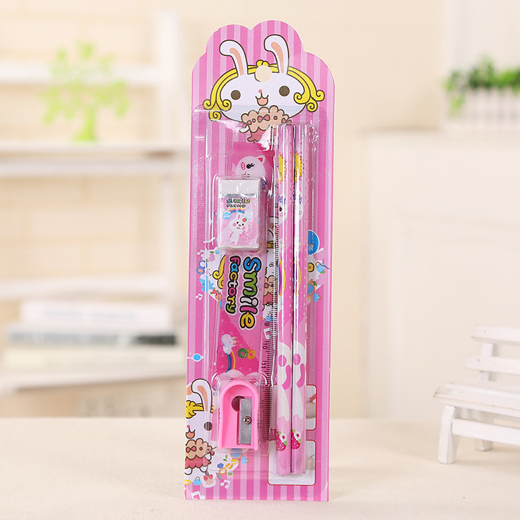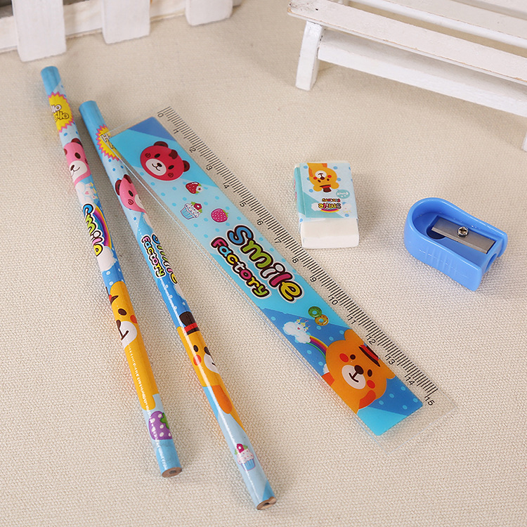 Product Details: 5-piece stationery set (2 pencils, 1 ruler, 1 eraser, 1 pencil sharpener)