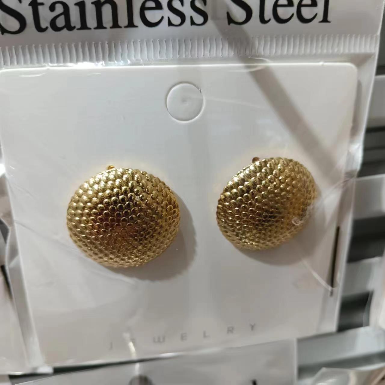 Factory wholesale stainless steel earrings, 18k real gold electroplated titanium steel retro embossed square bread hollow earrings